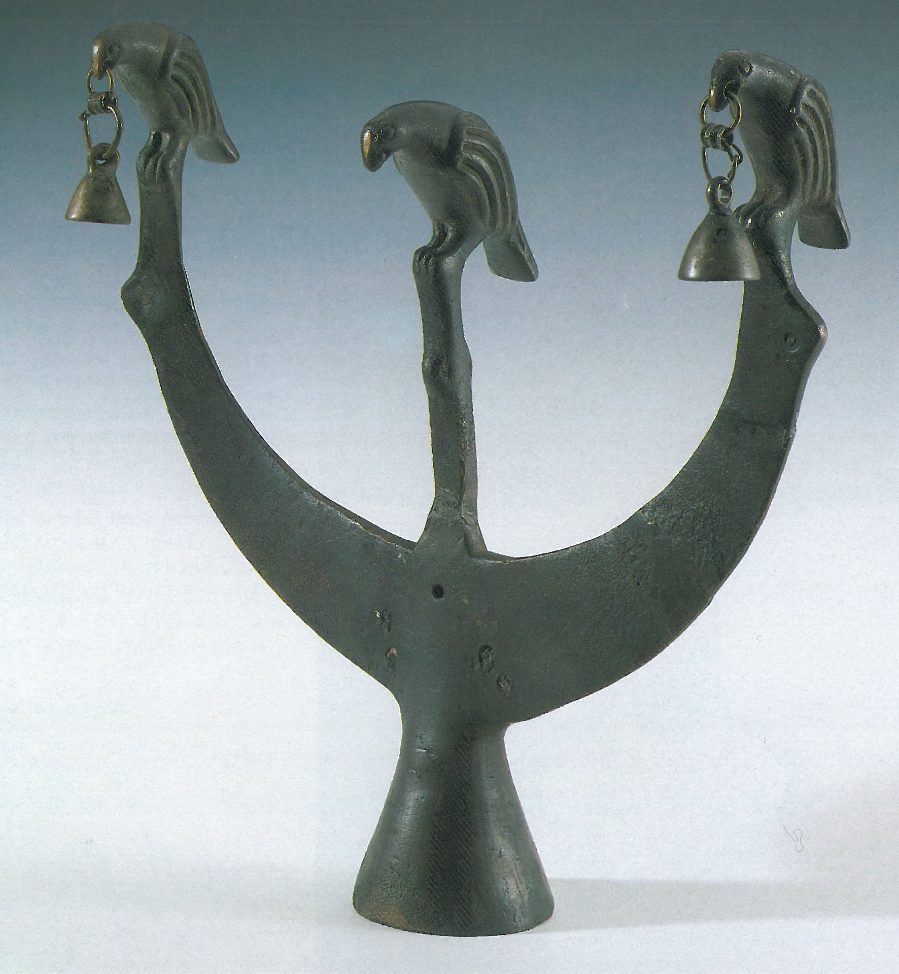 그런데 유적에서 출토되지 못하고 지표에서 우연히 발견된 유물 가운데 흥미로운 간두령이 있다. 사방으로 가지가 네 내 퍼져 있고 중앙에 팔을 벌인 남성이 묘사된 것이다. 그의 머리에는 팔을 벌인 새가 그의 머리를 덮고 있다. 두 남성의 양손 끝에는 방울이 달려 있고, 그의 머리 위에 새의 날개 끝에도 방울이 달려 있다. 청동 방울가지의 하단에는 정확하게 어떤 동물인지는 알 수 없지만 꼬리와 귀의 표현이 뚜렷한 육상동물이 가지 끝을 향해 달려 있다.