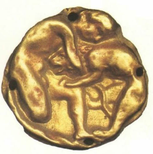 그런데 기원전 4세기 체르토믈리크 유적에서는 둥근 원판에 남성이 동물과 싸우는 장면이 묘사된 것이 발견되었다. 이 남성은 벌거벗은 채 사자의 목을 조르고 있었다(그림 1). 거의 같은 구도로 스키타이 남성이 그리핀과 싸우는 장면이 네모장식판으로 만들어져 유적에서 출토되었다(그림 1). 이 남성은 턱수염과 복장으로 보아서 스키타이 남성이다. 둥근원판을 헤라클레스라고 한다면 이 남성은 헤라클레스의 역할을 하는 스키타이 신이었을 것이다(그림 2).