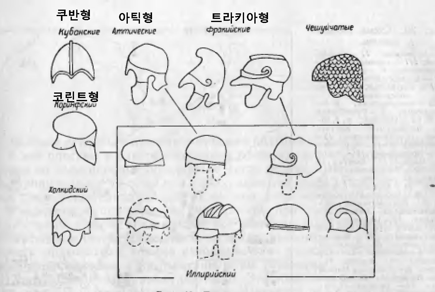 흑해 북쪽에서 발견되는 그리스식 헬멧은 두 가지가 있는데, 코린트(그림 1-5,6)와 아틱(attic) 스타일이다. 코린트 스타일은 완전히 머리를 덮는데, 눈만 내 놓은 것이다. 두개골 부위와 얼굴부위가 따로 제작되어 붙인 것으로 하단의 얼굴보호대는 목까지 보호할 수 있도록 되어 있다.