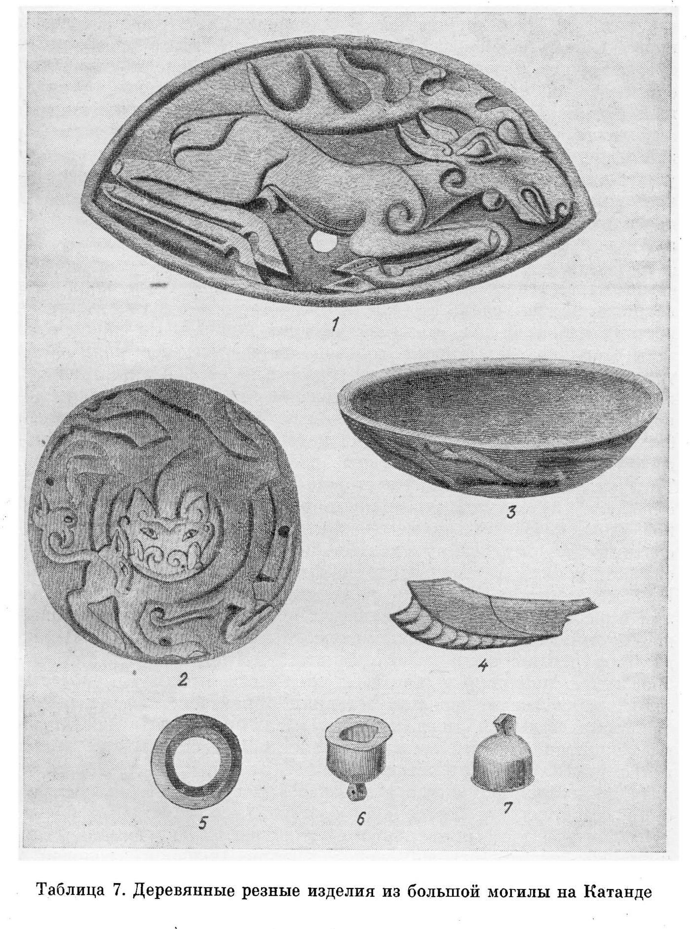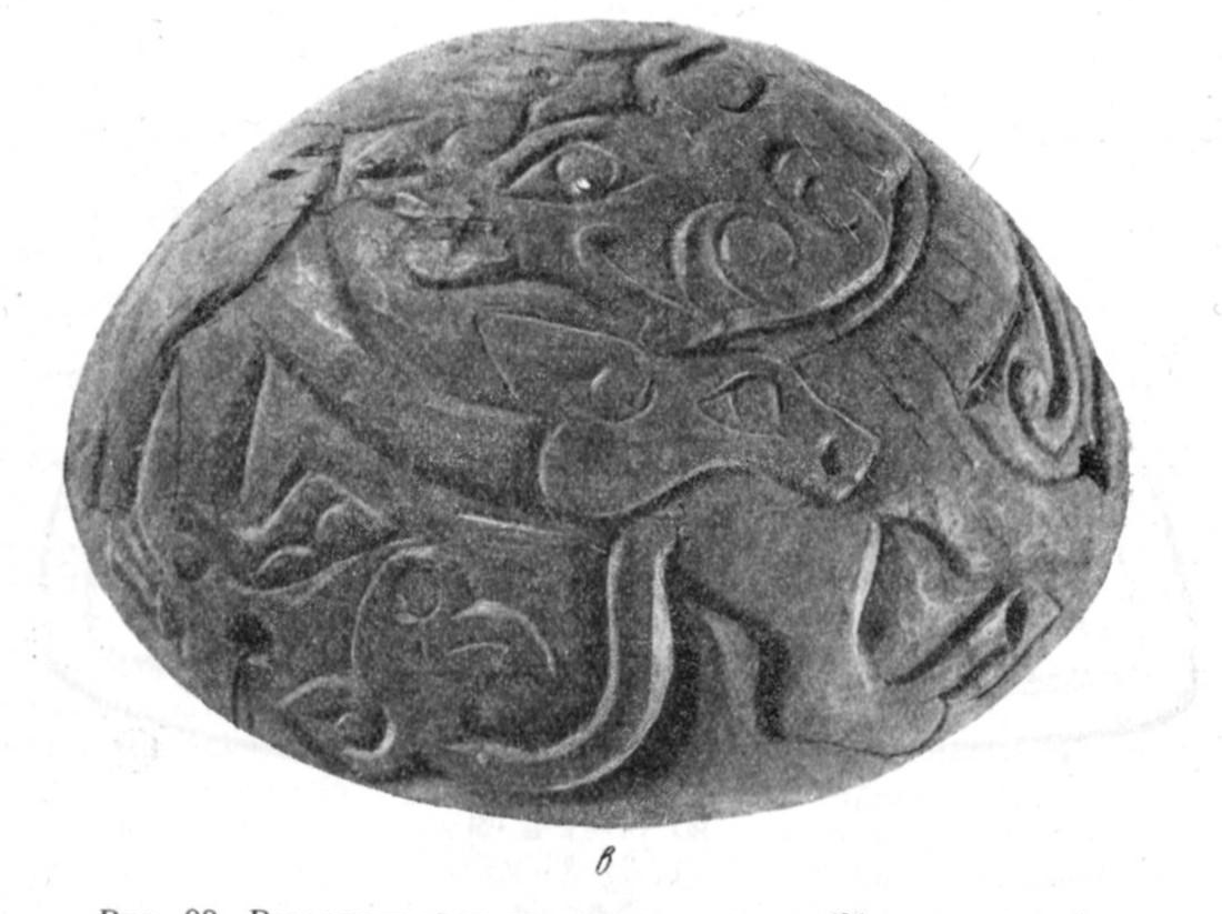 그런데 무엇보다 흥미로운 것은 어제 보여드린 호랑이가 사슴의 목을 잡는 장면이 새겨진 나무장식과 함께 발견된 목제 동물장식이다. 여기에는 두 마리 동물이 투쟁하는 장면이 그려져 있는데, 곰과 함께 신화적 동물이 그려져 있다고 라즈돌로프는 평가했다. 다리는 초식동물의 발굽이고, 새의 머리는 뿔로 장식된 그리핀이며, 몸통은 호랑이인 동물이 곰의 머리를 한 동물과 함께 엉켜 있는 장면이다(그림 3-2). 몸통을 표현하고 있지만 머리가 중점이 된다는 점에서 생각해 볼 부분이 많은 동물장식이다. 곰이라고 본 동물은 가장 중간에 큰 머리가 있는 동물이다. 이 유물은 반구형이다(그림 4).