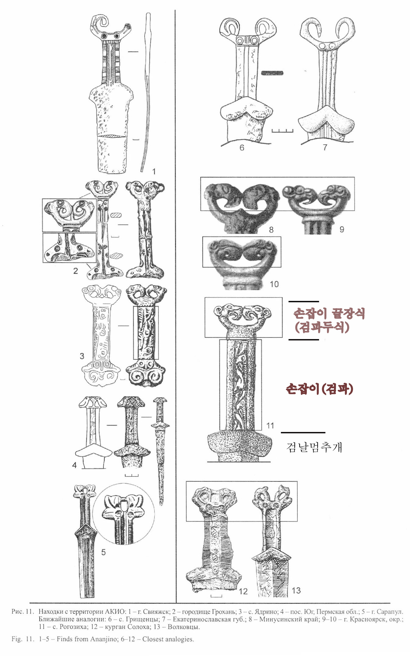 하지만 이는 수입품은 아니다. 손잡이 끝은 매우 유사하지만 손을 잡는 부분과 날과 손잡이의 경계 부분(검날멈추개)은 차이가 있기 때문이다. 스키타이 문화에서 검날멈추개 부분은 ‘나비’모양(그림 1-6,7, 11, 12,13)이라고 한다. 손잡이와 검날멈추개 부분에는 문양이 없고 단순하다. 반면에 아나닌스카야 문화에서는 문양이 화려하게 남아 있다. 손잡이에 문양을 표현하는 것은 볼가 하류에 있던 필리포프카 유적(사르마트 문화의 유적 , 스키타이 문화의 유적 가운데 볼가 하류의 지역문화)특징 중에 하나이다.