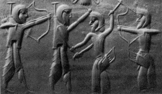 또한 실린더모양의 토제 도장(그림 5)에서도 고깔모자를 쓴 스키타이 2명의 궁수들이 활을 쏘는 장면이 조각되어 있다(체르넨코 1965).