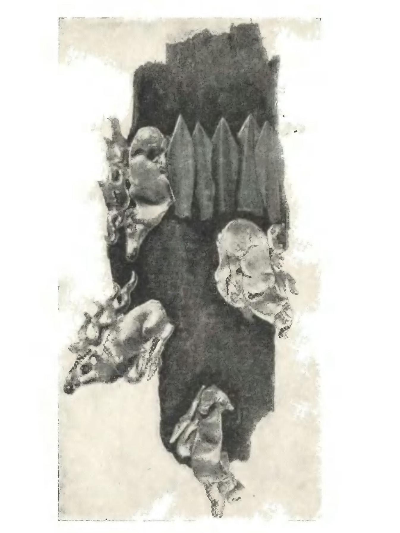 그런데 사슴장식은 화살통을 장식했던 것이다. 청동화살촉 8점(그림 4)을 황금 사슴 4마리가 달린 가죽 화살통(그림 2,3)에 넣어서 무덤에 부장했었다. 청동화살촉의 평면형태는 마름모 모양에 가까운데(혹은 사다리꼴) 정확하지는 않다. 중앙에 능이 선명하며 양쪽으로 날개가 있다. 이런형태는 아나닌스카야 문화에서도 확인된 것이다.