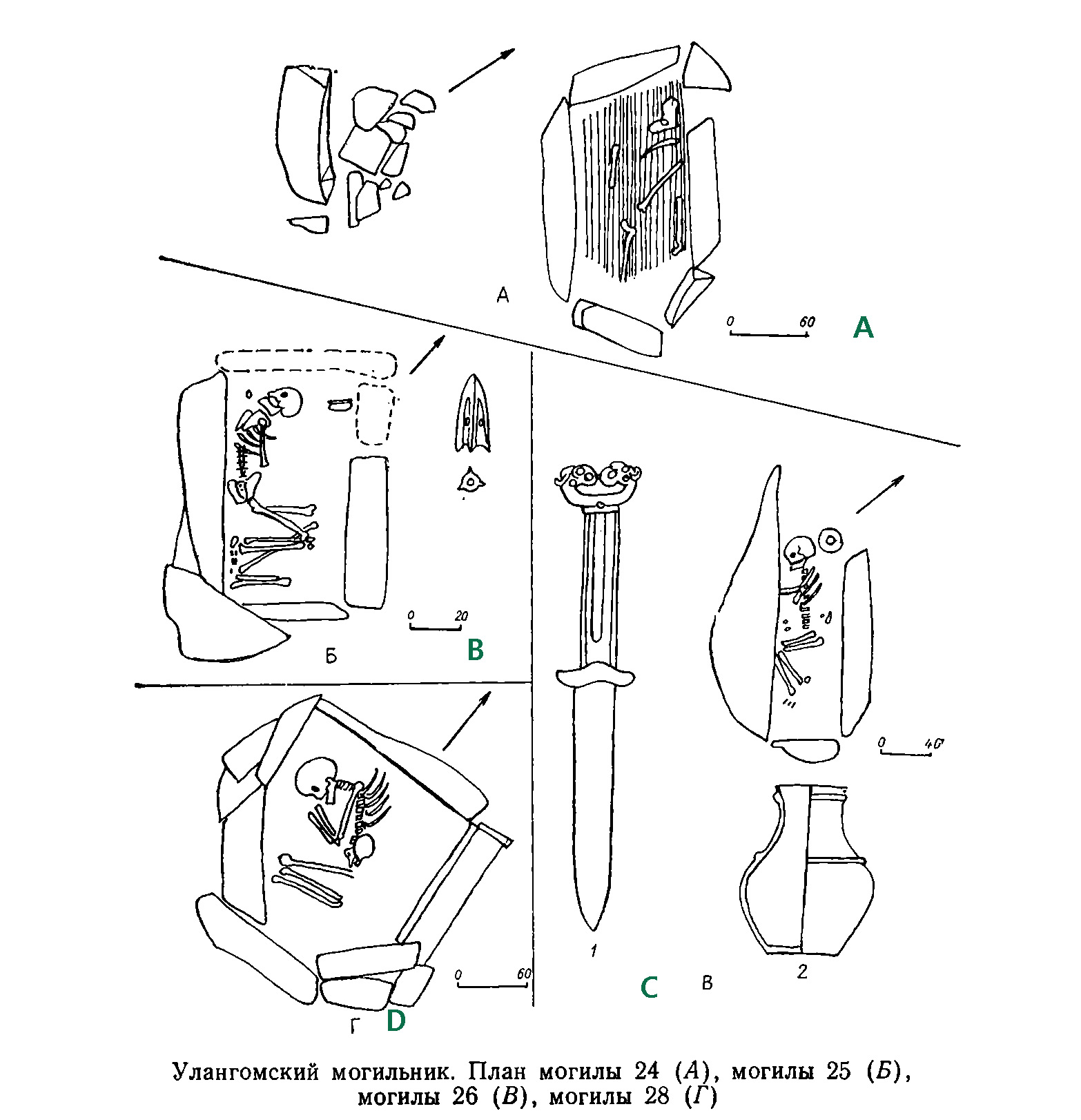 24호(1,05×0.6m)에는 남성의 뼈가 무질서 하게 발견되었고, 바닥에는 가죽을 깔았다. 그 외의 출토유물은 없다. 26호에서도 1구가 발견되었는데, 인골이 무질서하게 흩뜨러졌고, 두개골은 찌그러졌다. 하지만 인골은 오른쪽 측면으로 무릎을 굽힌 채 피장되었고, 머리맡에서 토기(그림 1-C-2)가 발견되었다. 그 외 출토유물은 25호와 같은 청동화살촉, 청동단검(그림 1-C-1), 토기가 발견되었다. 청동단검의 끝에는 새 머리 모양의 그리핀이 마주보고 있는 장식이 발견되었다. 이 유물은 몽골 북쪽에 위치한 미누신스크 분지의 타가르 문화(스키타이 문화의 미누신스크 지역문화)에서 많이 발견되는 것이다. 또 인접한 추야강의 울란드리크 유적에서도 출토된 바 있다(그림 2)