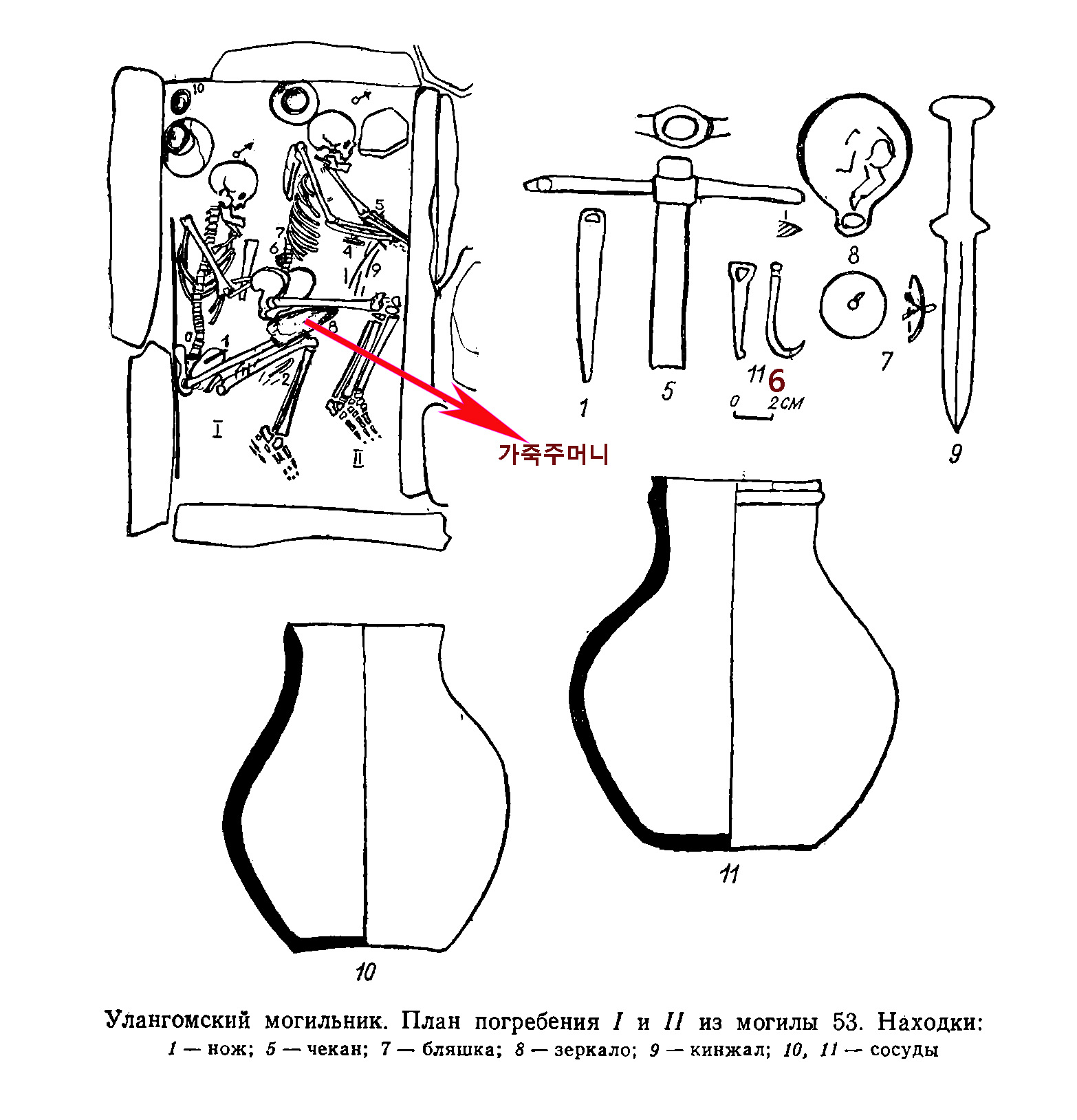 그림 2. 울란곰 유적의 53호 돌널 무덤과 출토품. 1. 청동칼, 5. 투부(전투용도끼), 6, 청동고리(11번이 아닌 6번), 7. 청동패식, 8. 청동거울. 9 청동단검, 10,11토제항아리
