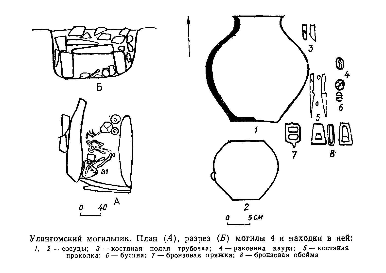 몽골 울란곰 유적에서도 통나무관이 발견되는데 어린아이를 위한 것이다. 깊지 않은 무덤 구덩이에 통나무에 홈을 내어 만든 관이 있었다. 길이는 80cm, 너비는 30cm이다. 안에는 머리를 남쪽으로 향한 2살짜리 아이의 뼈가 있었다. 관 바깥 남서쪽 모서리 부근에는 토기가 발견되었는데, 평행하게 배열된 호선으로 구성된 문양(그림 1-1)이다.
