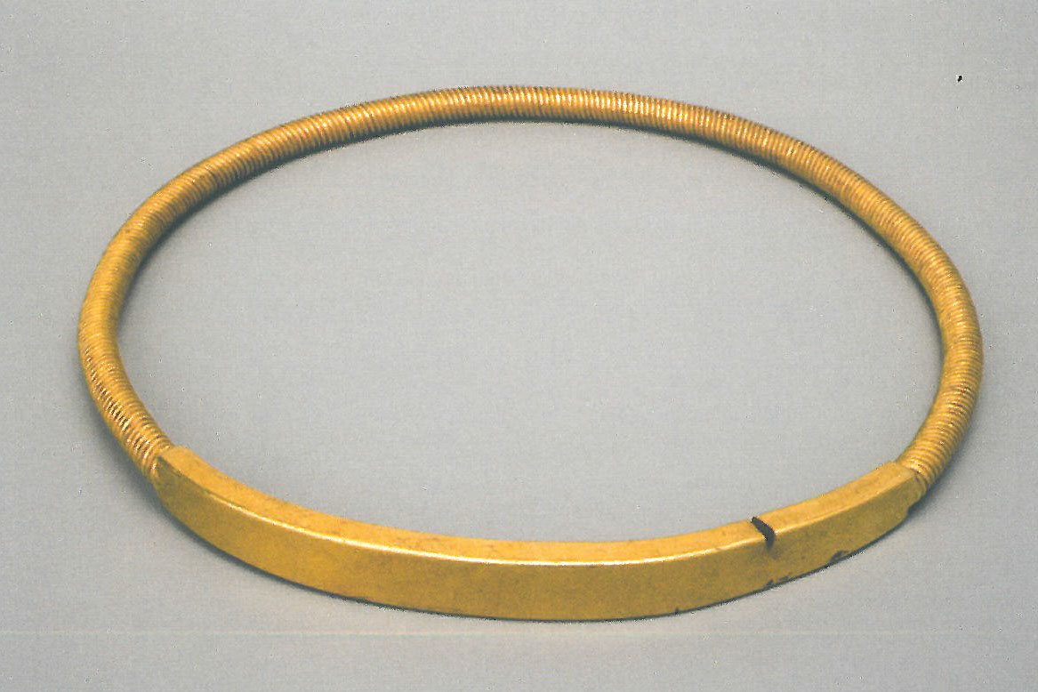 위에서 언급한 알타이의 유적은 기원전 5세기 유적인데, 남성이 목걸이를 착용한 예는 기원전 7세기 중반 아르잔-2호에서부터 발견된다. 1kg이 넘는 목걸이다(그림 4). 기원전 5세기 유적과는 달리 닫힌 모양이고 앞 부분이 두툼하게 장방형 판이 붙은 모양이다. 그런데 동물장식은 없지만 구조적으로 같은 유물이 표트르 1세의 수집품(그림 5)에서도 발견되었다. 이 유물은 동물장식도 없어서 매우 단순한 편이지만 다소 금이 많이 사용된 유물(941.8g)이라는 점 외에는 특징적이지 않았다. 아르잔-2호의 발굴로 이러한 스타일의 목걸이가 기원전 7세기 유물일 가능성이 많아진 것이다. 표트르 1세의 유물 가운데 맹수장식과 함께 이른 시기의 유물로 생각해 볼 수 있다.