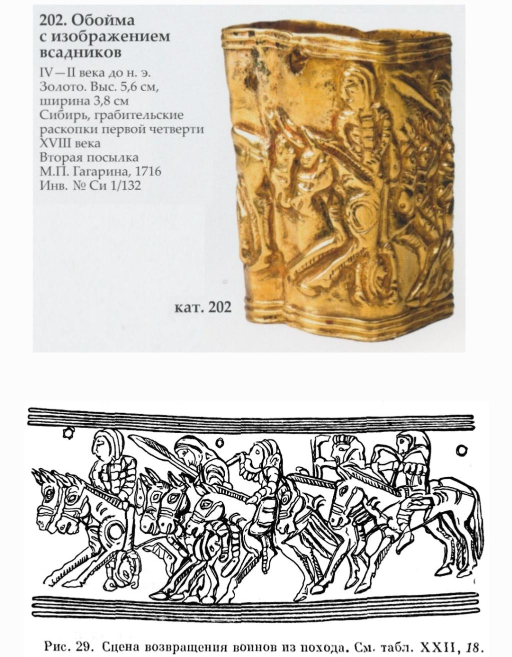 여기에 표현된 전사 5인은 전쟁에서 막 이기고 돌아오는 장면을 표현한 것이다. 가장 앞의 말탄 기수 옆에는 말 안장 위에 전사의 시체를 던져 머리를 숙이고 있고, 그 뒤를 이어 나란히 뒤따르는 세 마리 말 중에 한 마리에도 역시 시체가 매어진 상태이다. 세 마리 말 중에 한 사람은 한 손에 검을 들고 생포한 장수(리더?)의 등을 겨누고 있으며, 그 뒤에 두 마리 말위에 탄 궁수는 생포한 전사를 향해 시위를 당기고 있다. 말을 탄 전사들은 헬멧을 쓰고 있는데 파지리크 유적 3호에서 출토된 것과 유사하다. 파지리크 3호 유적은 파지리크 5호, 2호, 1호(기원전 5세기)에 비해서 늦은 시기로 기원전 3세기 경에 해당한다. 코롤코바는 기원전 4~2세기 유물로 보았다. 기원전 2세기는 이미 스키타이시대는 아니다. 루덴코나 코롤코바 모두 기원전 5세기 보다 늦은 기원전 4~2세기