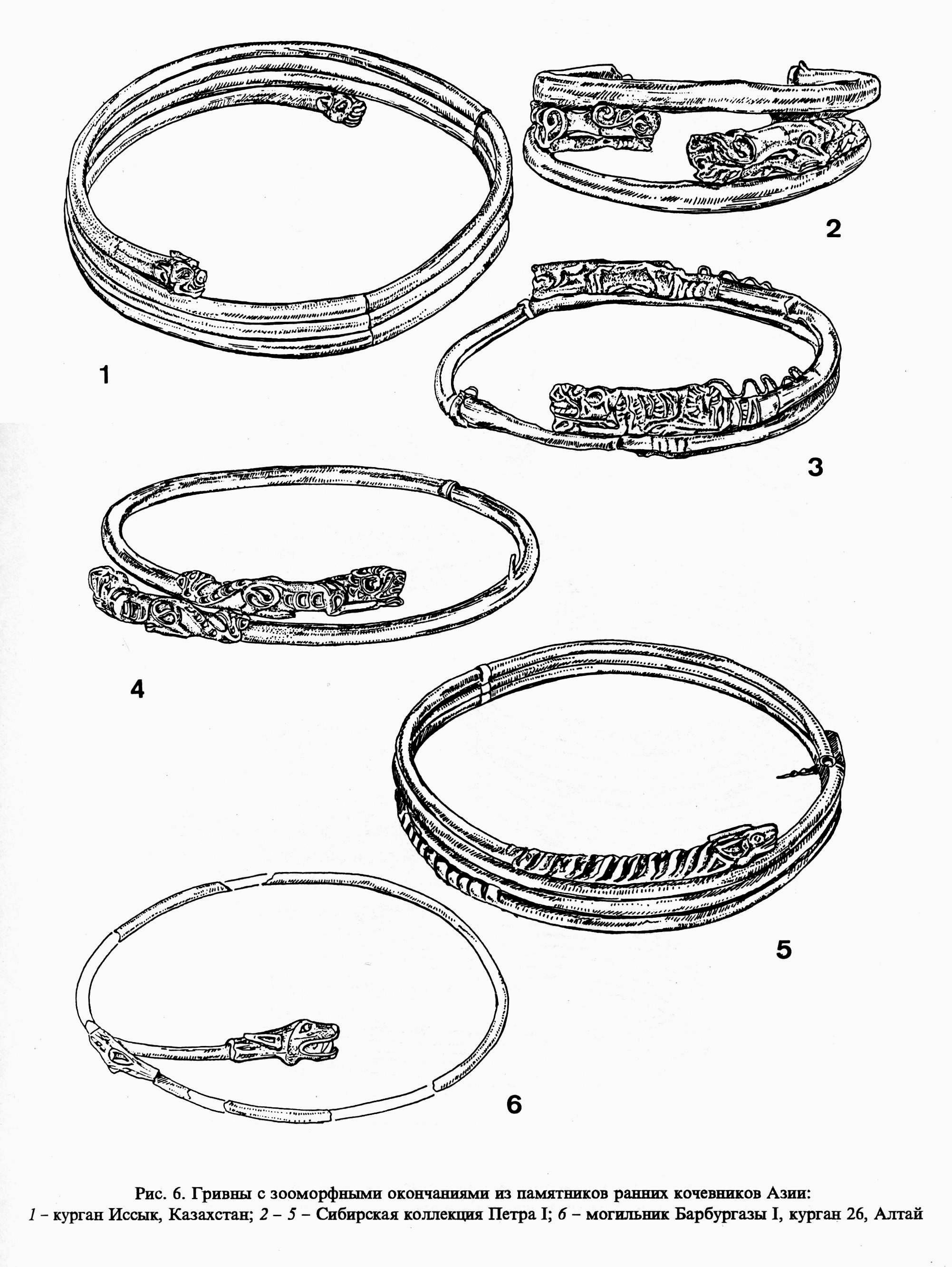 표트르 1세의 시베리아 컬렉션 가운데 목걸이를 코롤로바는 크게 3가지로 구분했다. 양 끝이 약간 열려 있으면서 동물장식이 붙은 것(그림 2), 후프가 나선형으로 돌아가도록 세팅 된 것(후프가 2~3번 감긴 것)(그림 5-2~4), 나선형(그림1)으로 꼬인 것이다.