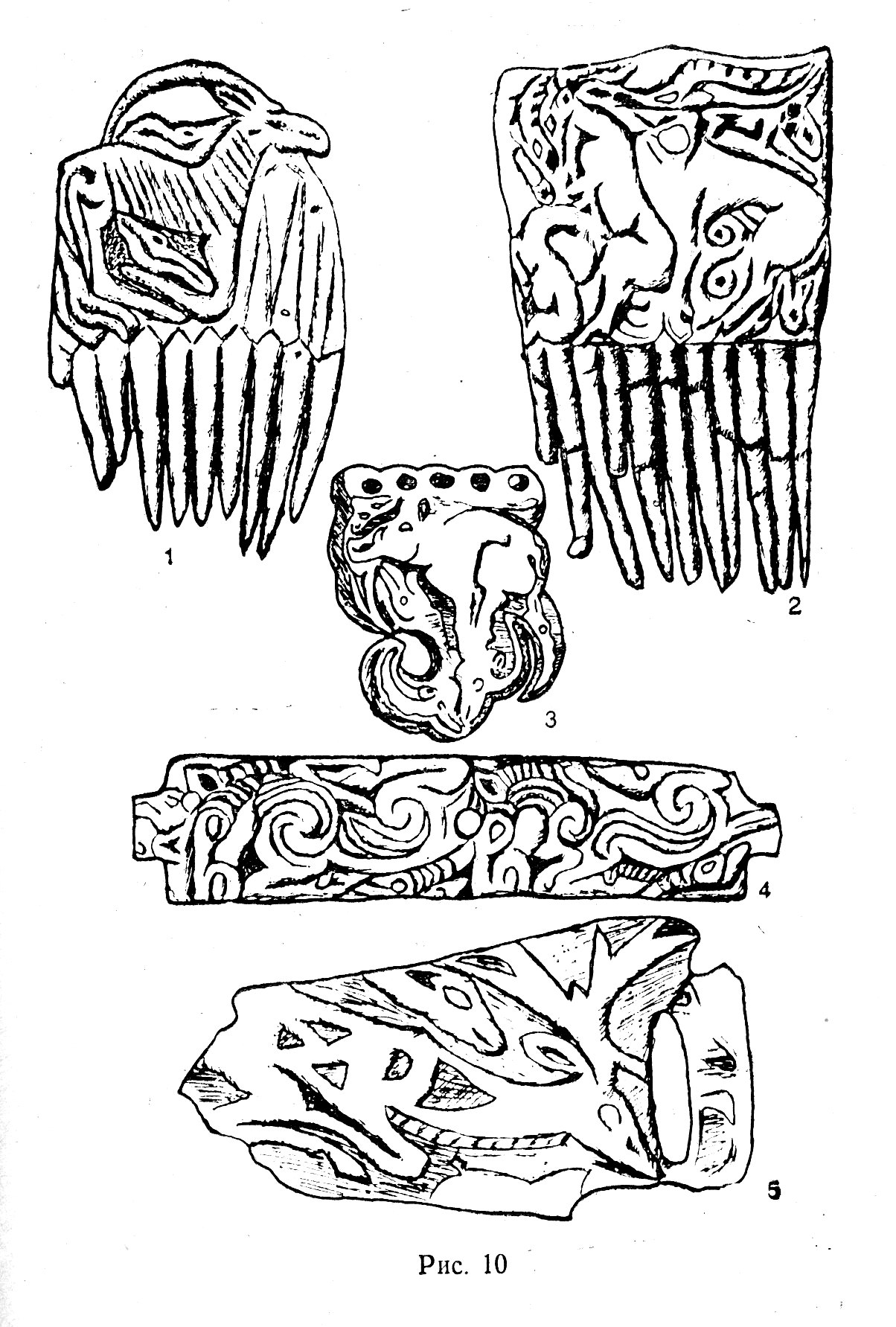 그림 1. 수수께끼 동물장식, 1,2-헴칙-봄(투바), 3-타스몰라(카자흐스탄), 4-사글리이-바쥐(투바), 5-울란 곰(몽골)