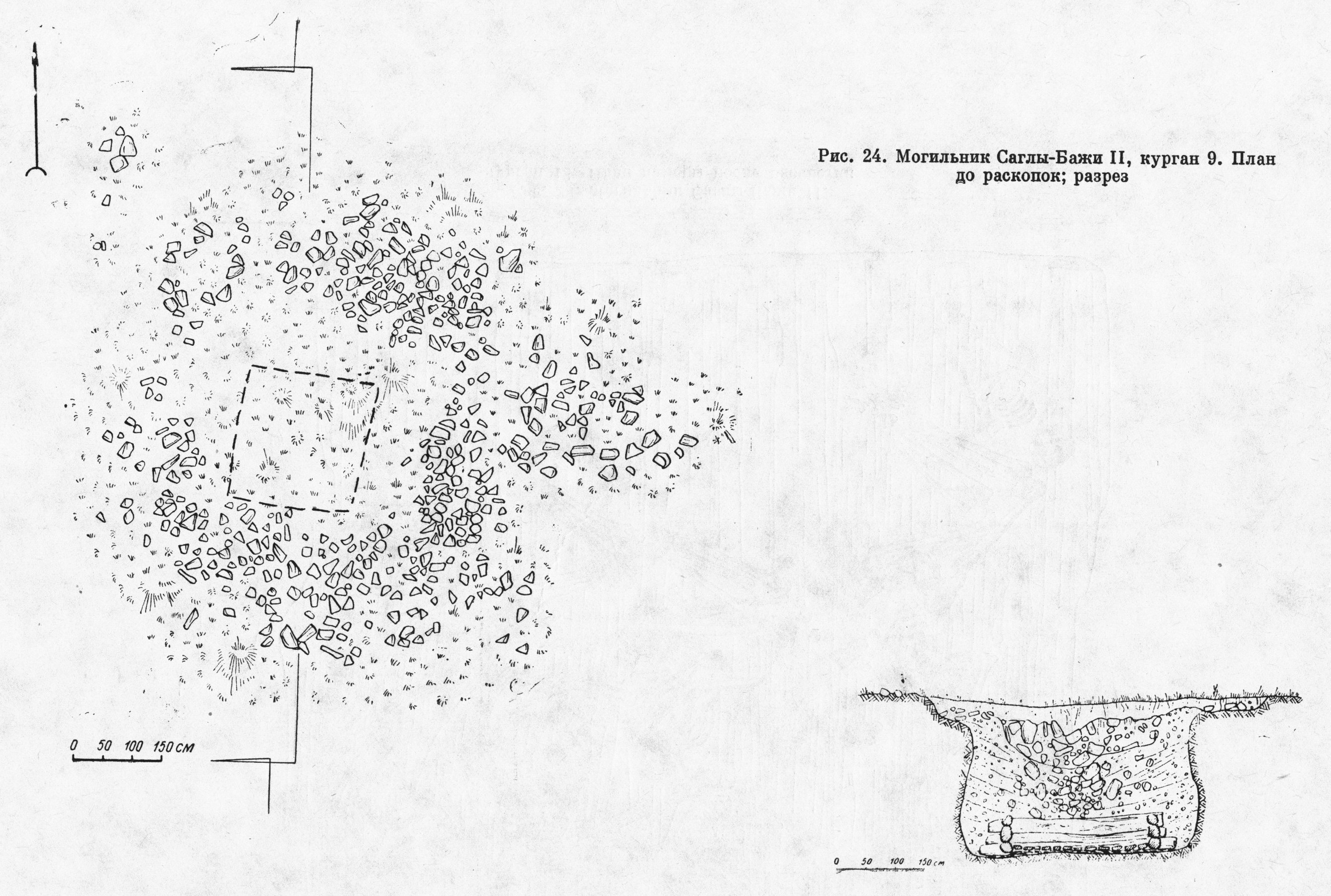 기원전 7세기 사글리 바쥐 II유적의 무덤은 아르잔-2호의 5호묘와 상당히 유사하지만 아르잔-2호는 나무무덤방으로 된 5호묘 외에도 돌널무덤인 무덤과 함께 같은 호석과 봉분으로 만들어졌다는 점에서 큰 차이가 있다. 특히 투바의 유적은 봉분을 만들지 않았다는 점에서 알타이의 유적과도 차이가 있다.
