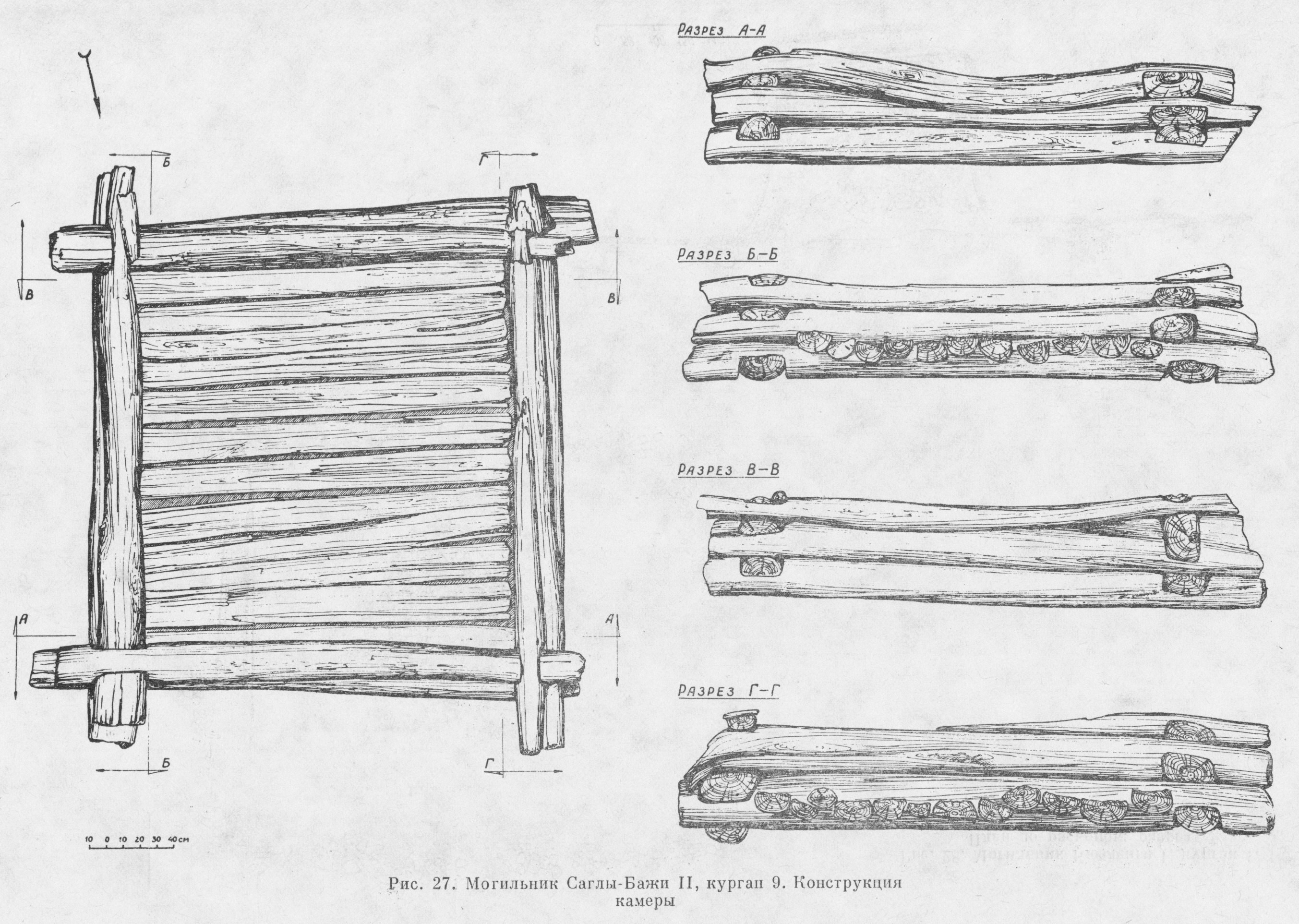 9호 무덤은 무덤방 시설이 잘 남아 있는데, 동서방향(단면도 1,3)의 동과 서벽은 3개의 통나무, 남북방향(단면도 2,4)의 남과 북벽은 3개 반의 통나무를 사용해서 쌓았다(그림 2).