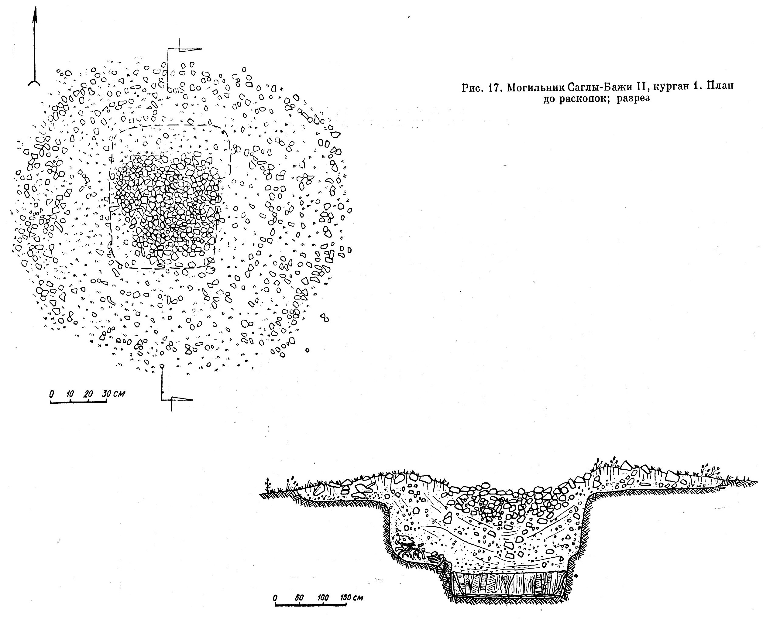 그림 3. 사글리 바쥐 II유적 8호의 무덤 가장 위 평면도(위)와 단면도