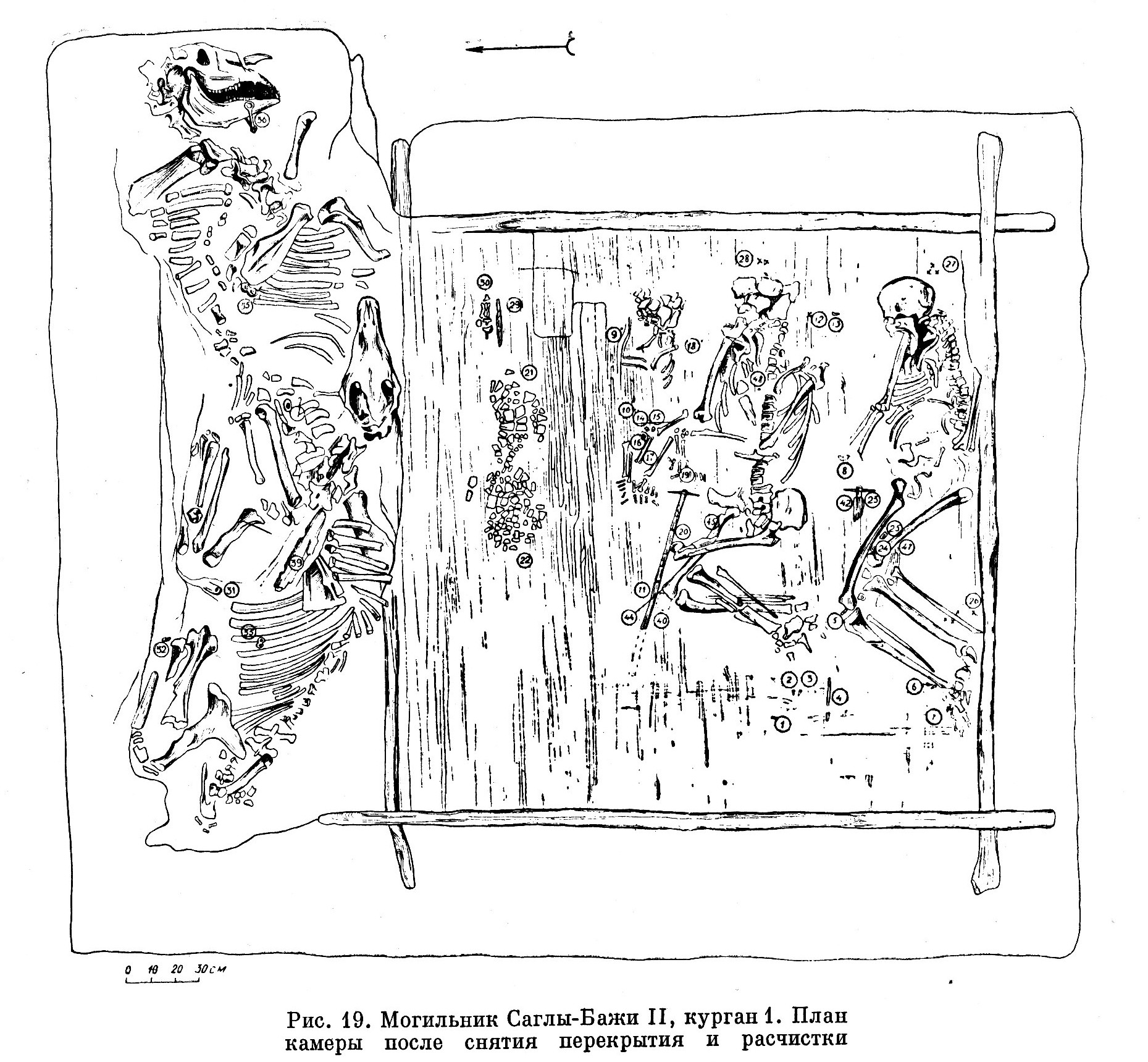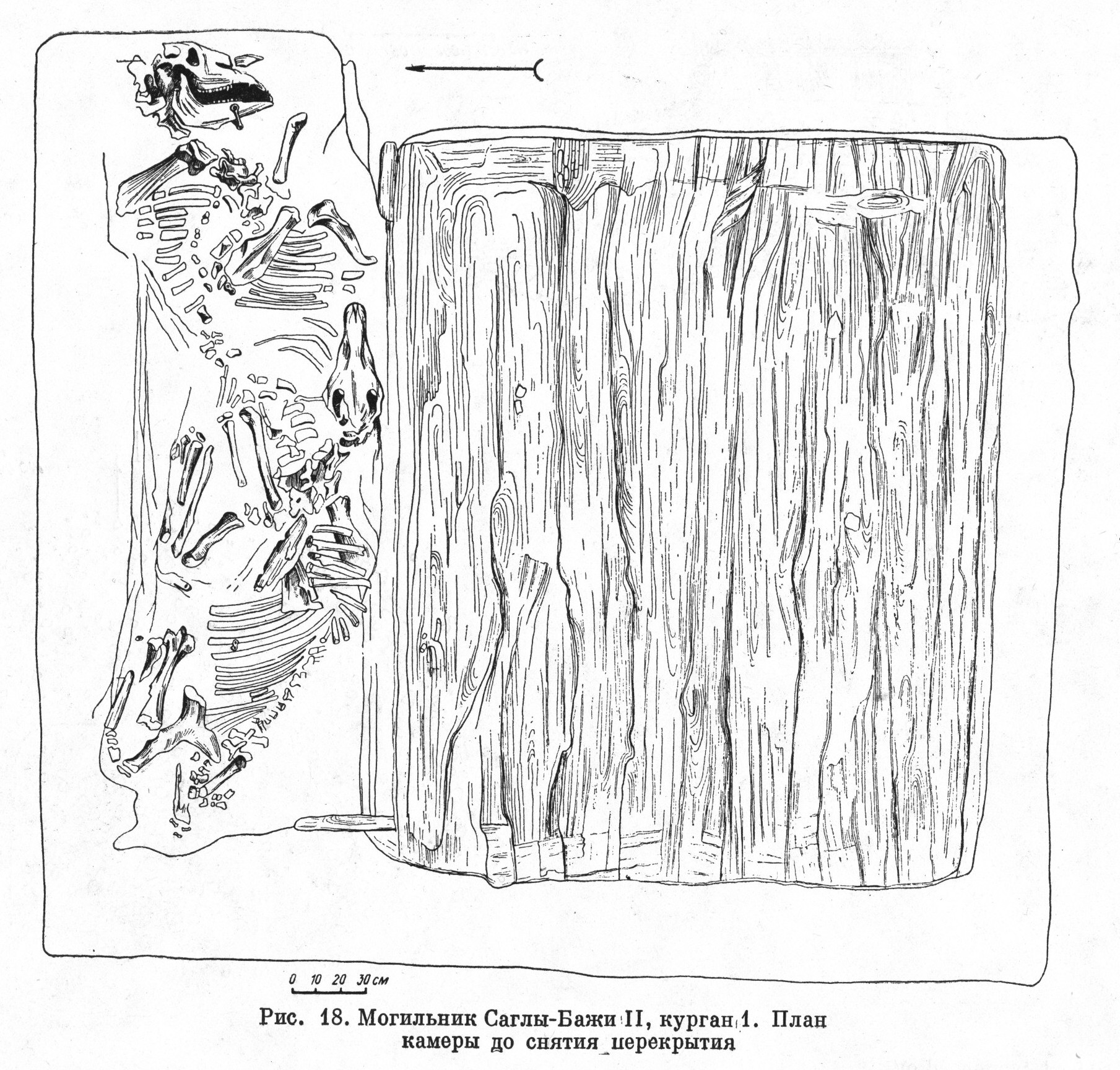 말이 부장된 1호는 사람과 말이 같은 레벨에 부장되지 않았고 말을 더 높은 단계에서 뭍은 것이다(그림 6)(말이 함께 부장된 파지리크 유적과 아크 알라하-3, 베르흐 칼쥔 II유적 등 알타이의 유적에는 말과 인간은 같은 레벨로 부장되었다).