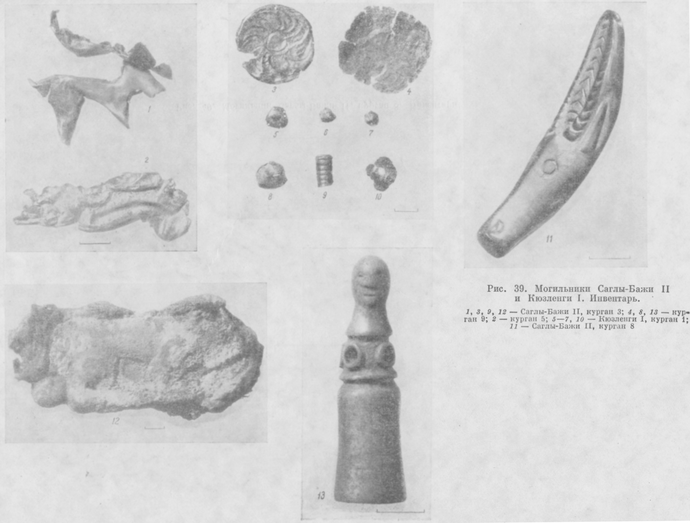시베리아 투바 공화국에서는 사글리 바쥐 II 유적의 8호 유적에서는 울란곰 유적을 소개하면서 보여드렸던 인간형상물(여성)(그림 1)이 발견되었다. 북쪽벽(39)(그림 2)에서 나왔는데, 어떤 인골의 유물이라고 볼 수 없는 위치이다. 이 유물은 동검의 손잡이 끝장식으로 만들어진 것이다. 뿐만 아니라 염소머리와 말 몸통의 외곽선에 붙은 어떻게 보면 작은 공간에 빽빽하게 문양을 채운 유물이 발견된다. 그라치는 카자흐스탄의 타스몰라 유적에서 나온 유물 가운데 비슷한 유물을 ‘수수께끼 같은 동물장식’으로 명명했다. 스키타이 문화권 내에서 투바 지역의 특색이 남아 있는 유물이자, 카자흐스탄과의 관련성을 보여준다고 생각해 볼 수 있다.