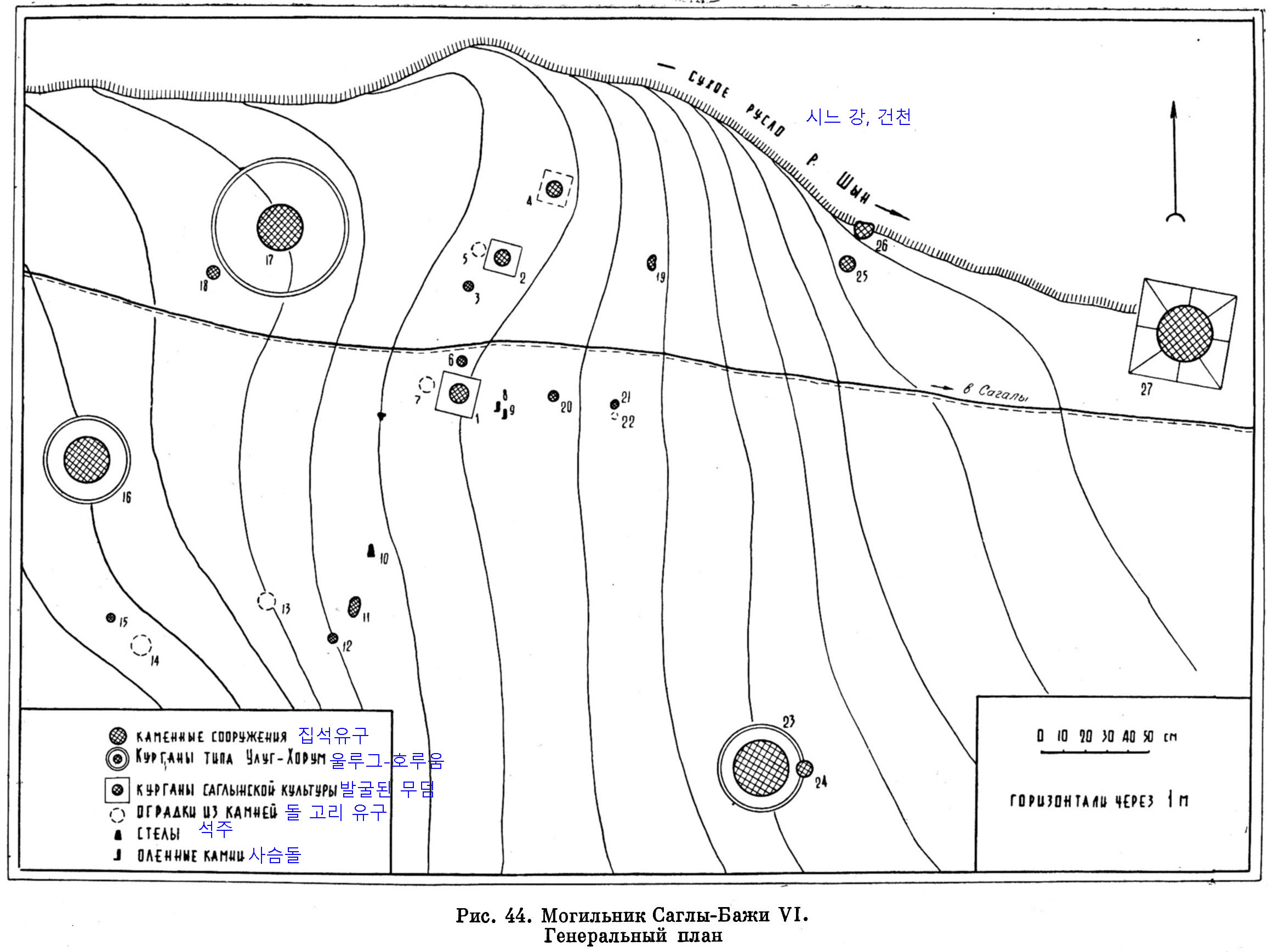 시베리아 투바의 사글리 바쥐 II 유적에서는 유적 전체 평면도가 없어서 답답했다. 평면도가 있는 유일한 유적이 있는데 사글리 바쥐 VI유적(그림 1)이다. 지표상에 드러난 유구는 모두 27개이며 그 중에서 발굴된 무덤은 3기, 그 외에도 특이한 유구가 3개 발견되었다.