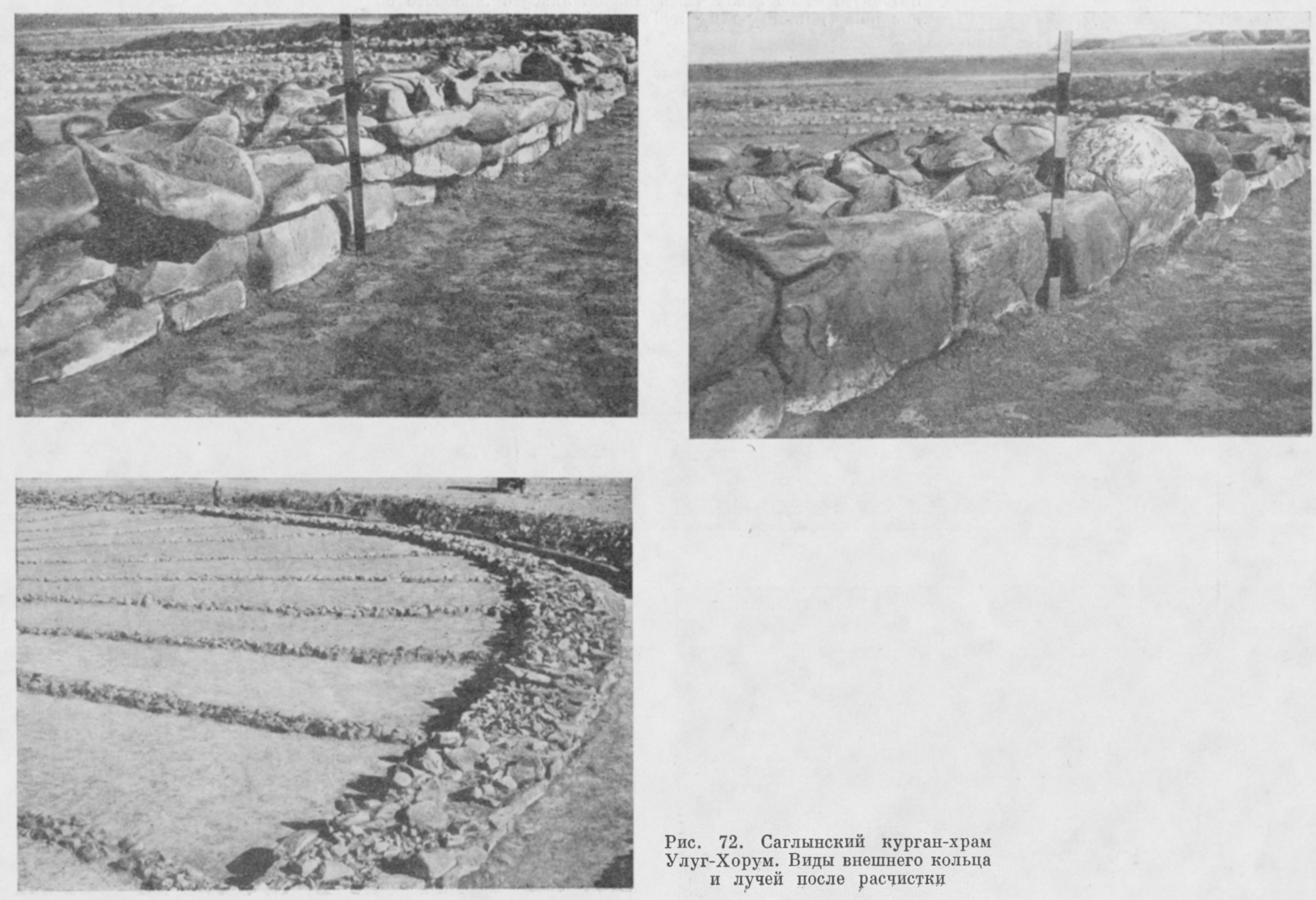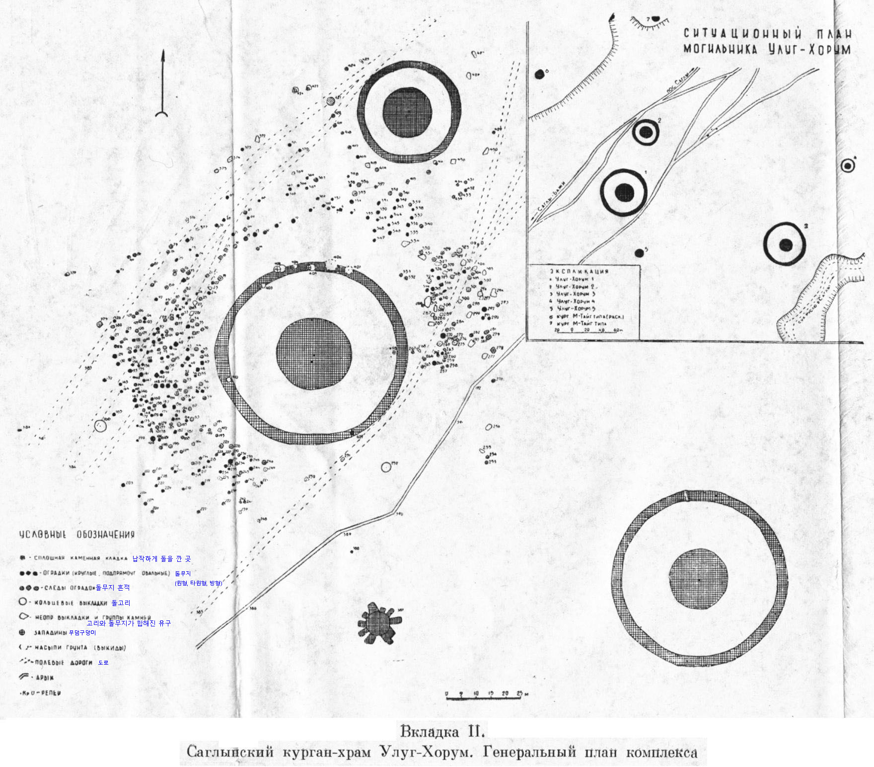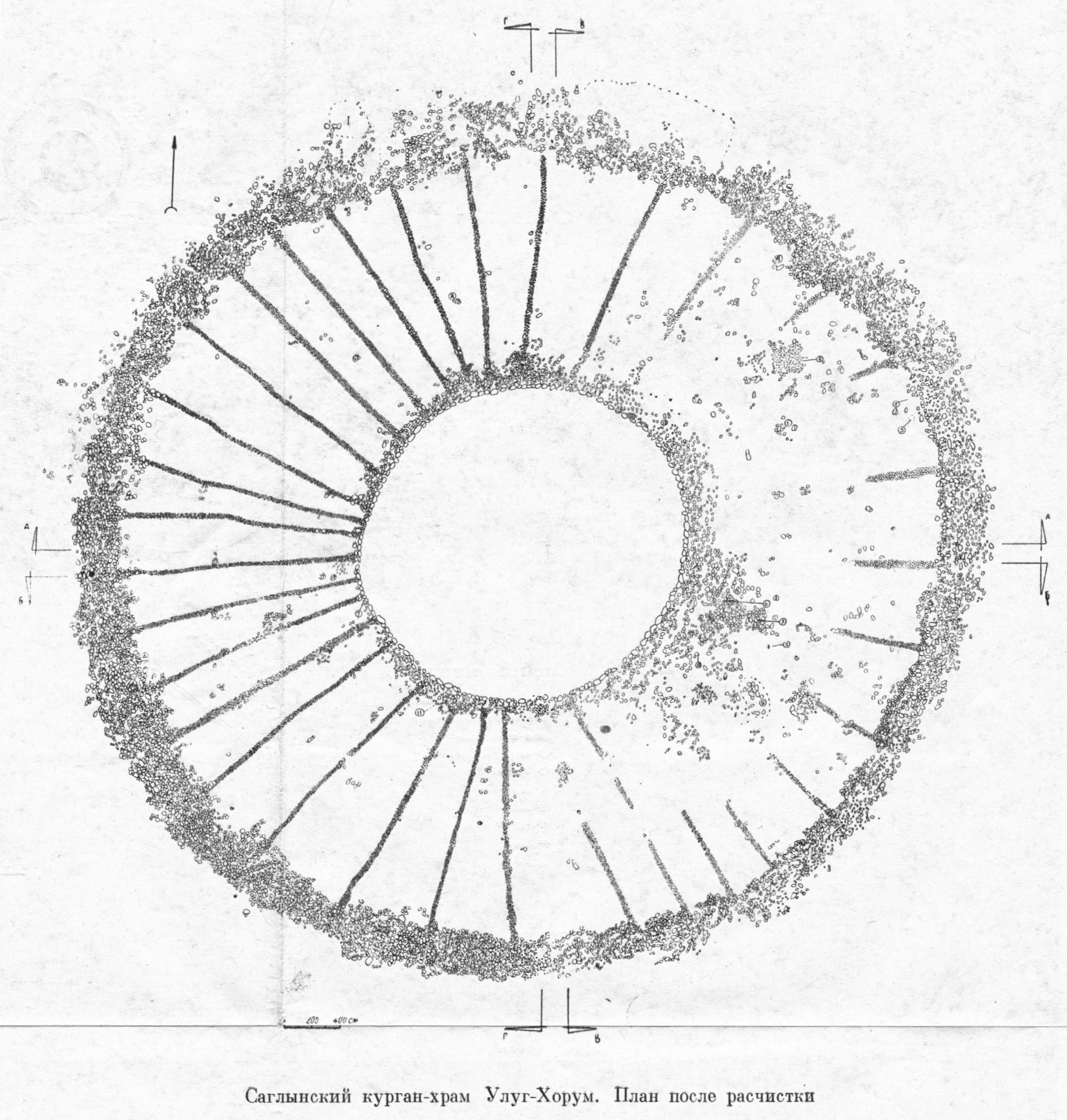 모두 32개인데, 러시아 연구자들은 이를 태양의 광선을 상징한다고 생각해서 ‘광선’이라고 명명했다(그림 2, 그림 3). 이 부분은 가장자리 호석에 닿아 있었다(그림 4). 중앙의 돌도 둥근 고리모양으로(그림 2) 돌을 돌린 것이 발견되었다. 처음에 의례유구로 축조된 모습은 그림 2이고, 나중에 중앙에 돌이 쌓인 것이다.