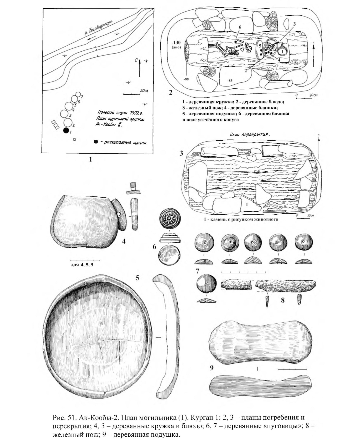 그림 1. 아크-코비 2유적, 1-무덤 배치도, 2-통나무관 안, 3- 나무덮개 관, 4-나무 잔, 5-나무 쟁반, 6-목제 단추, 7-목제 단추, 8-철제 칼, 9- 목침