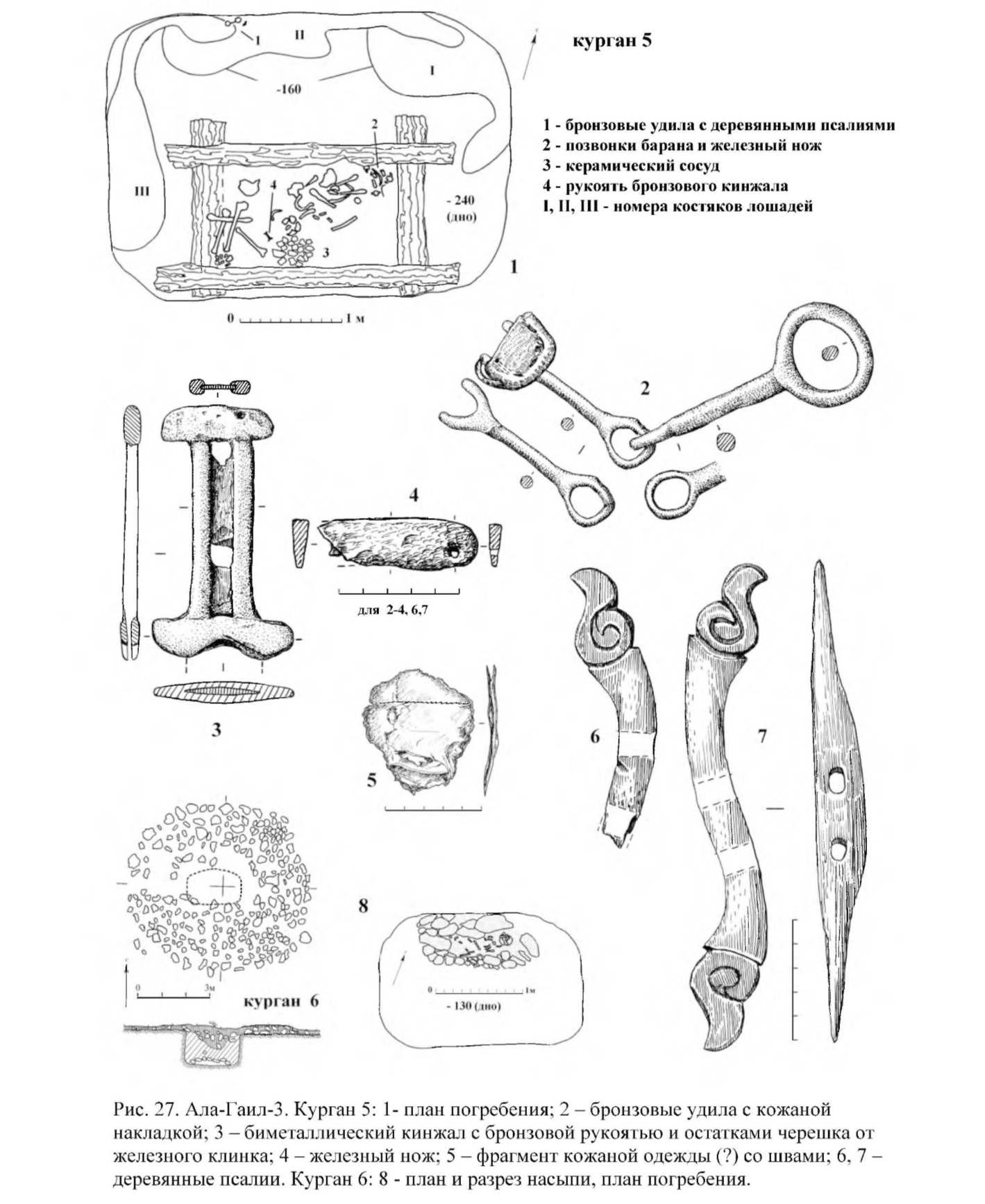 알라-가일 유적 11호 재갈을 연결하는 구멍(그림 1-1)은 크기가 다른 2개로 큰 구멍의 형태는 원형이라기보다는 약간 네모꼴에 가까운 것과 다른 쪽은 원형이다. 구멍이 2개인 재갈멈치, 양쪽 구멍의 형태가 다른 재갈멈치는 아르잔-1호에서 출토된 유물에서 발견된다.