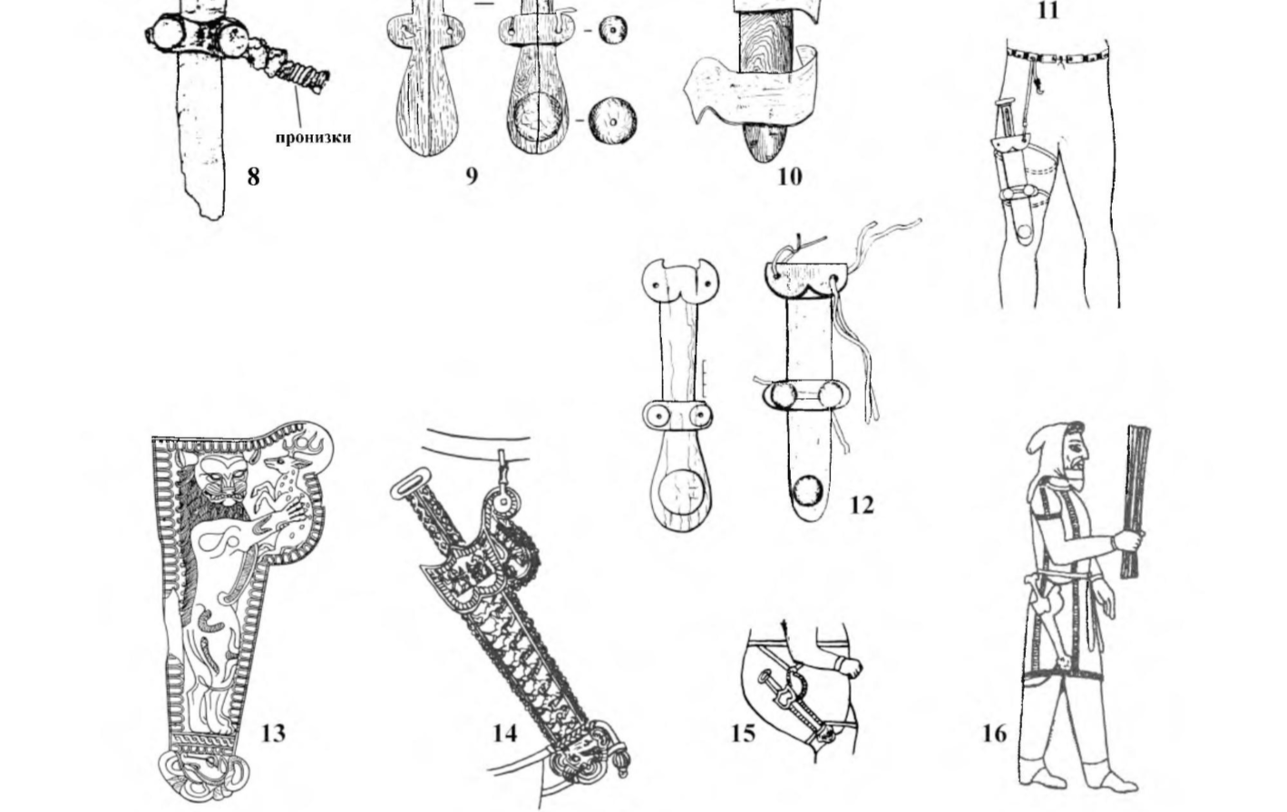 이미 스키타이 문화권에서 발견되는 검은 대부분 길이가 짧아서, 단순히 허리에만 착용할 수 없다. 허리끈에 보조끈을 달아서 우측 허벅지 위에 달았던 것으로 알려졌다(그림 2-11). 파지리크 문화(스키타이 문화의 알타이 버전)에서는 검은 대부분 오른쪽에 착용한다. 하지만 간혹 왼쪽에 착용한 것도 발견된다. 짧은 검이기 때문에 허리와 다리사이에 고정해서 착장하기 위해서는 검집에 특수한 부위가 있을 수 밖에 없다. 페르세폴리스의 아파다나 궁전벽화에 그려진 그림의 검은 검집 한쪽이 날개처럼 달린 부분에 허리와 연결시킨 흔적(그림 2-13~16)이 남아 있다. 실제로 켈레르메스 유적과 멜구노프 유적 등에서는 같은 스타일의 유물이 발견되기도 한다(그림 3).