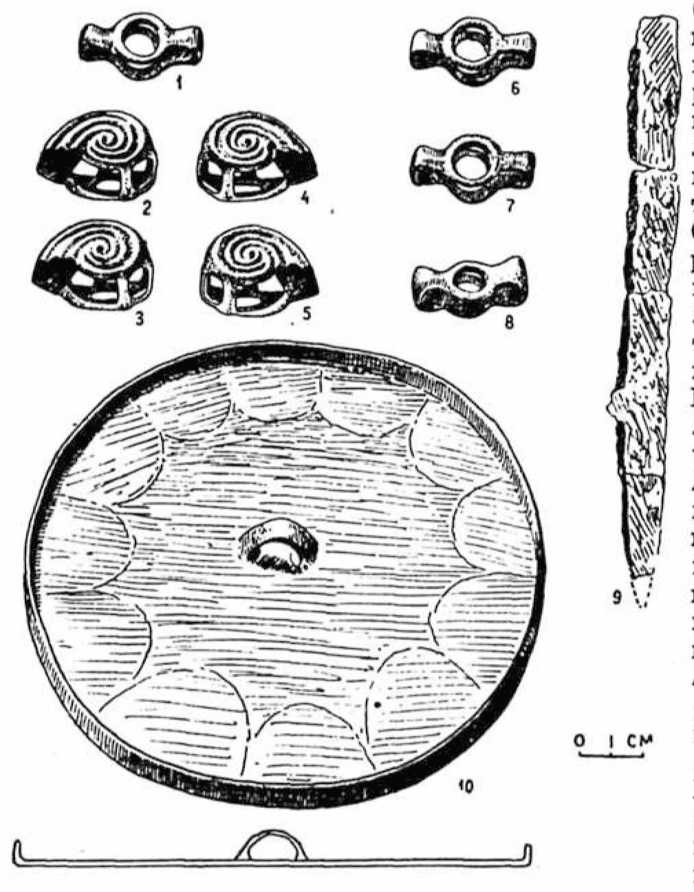 여성의 머리 아래에는 돌로 만든 장식을 깔고 눕힌 것인데, 모자장식이 아니라 돌베개의 이미테이션이다. 청동거울이 발견되었는데, 엉덩이뼈 부근(오른쪽)이다. 오른쪽 종아뼈 아래에는 말의 견갑골과 두개골이 있었다. 말의 두개골은 청동제 굴레장식(그림 2-1~8, 그림 3-5)과 재갈, 재갈멈치(그림 4-2), 동물장식(그림 4-1)가 있었다. 반대편에는 양 머리 2개체가 있었고 그 위에는 철제칼(그림 2-9)과 함께 칼을 가는 도구가 발견되었다.
