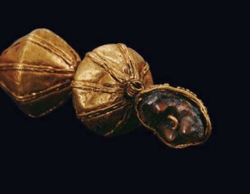 그런데 이 여성의 오른쪽 손목 부위에서는 11개의 주판알 모양의 금구슬과 5개의 펜던트가 발견되었는데, 팔찌로 추정되는 물건이다(그림 2).