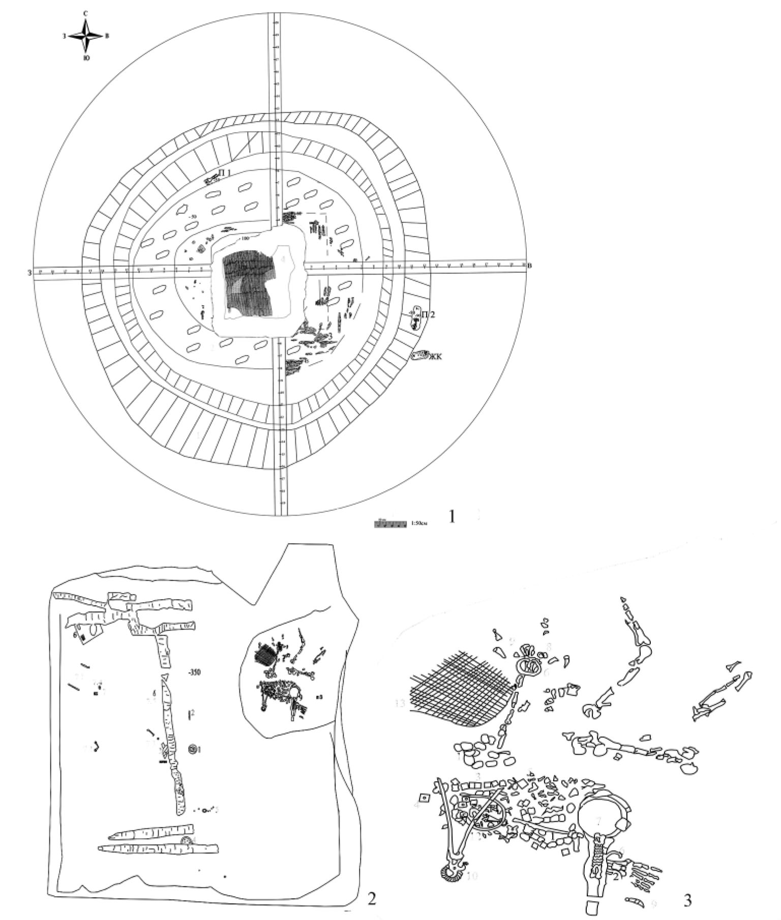 그림 5. 탁사이-1 유적의 6호분 평면도, 1- 무덤의 바닥 평면도, 2-중앙 무덤구덩이 바닥면, 3-6호분 내의 3호 무덤 유물 출토양상(고깔모자 쓴 여성)