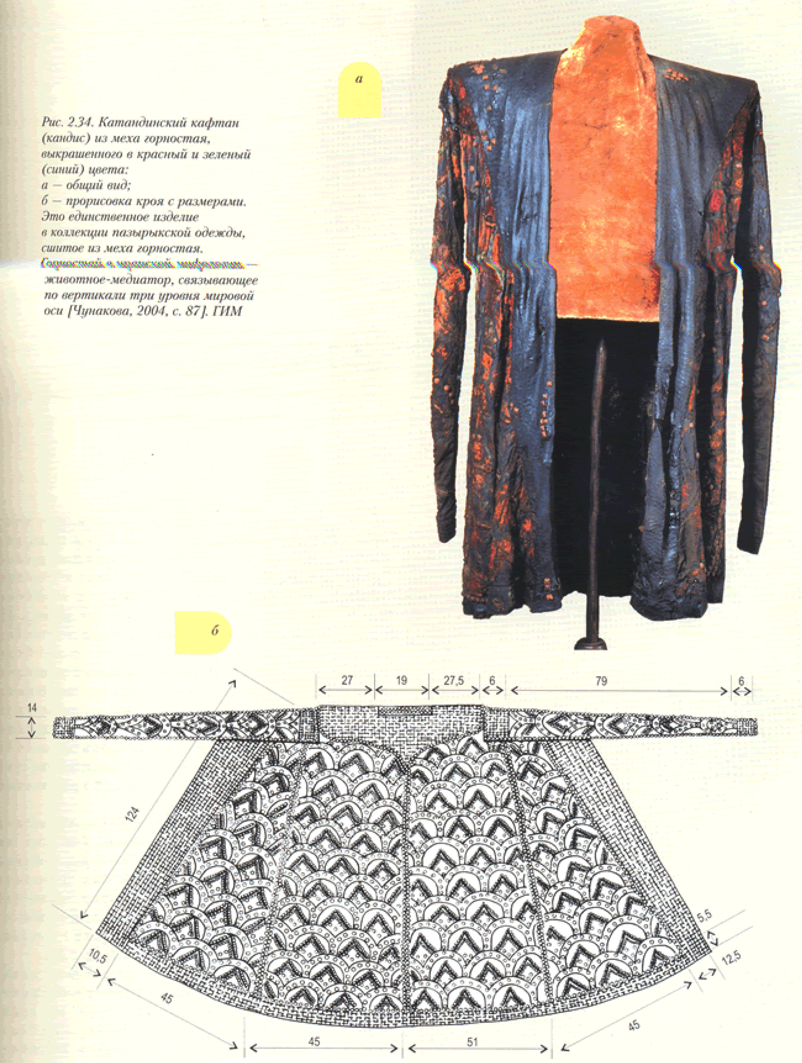 알타이의 또 다른 유적인 카탄타 유적에서도 여밈이 있는 상의(카프탄이라고 부름)가 출토되었는데, 가죽으로 제작되었고 가죽어플리케 장식과 담비털로각으로 화려하게 장식된 것이다.