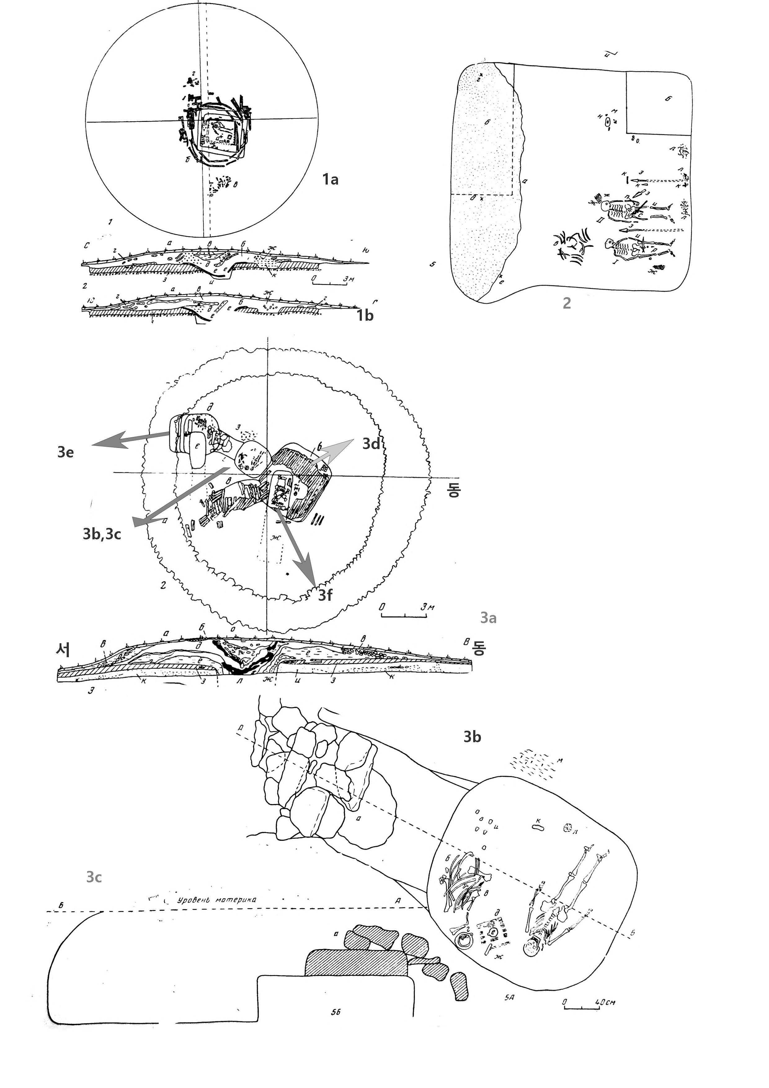 반면에 우랄강 유역의 무덤은 일정하지는 않지만 무덤구조에 나무로 된 방을 만든다. 이미 포스팅한 파트프마리 I유적 뿐만 아니라 타라-부탁(그림 1-1a,1b) 유적이 있다. 두 유적은 같은 시기(기원전 6세기)의 유적이지만 무덤 구조는 비슷한 듯 다르다. 바닥을 파는 방법이 다른 것인데, 파트프마리I유적은 시신을 안치하기 위한 공간만 팠고, 타라-부탁 유적에는 바닥 전면을 파고 목조구조물을 여러 겹 둘렀다.