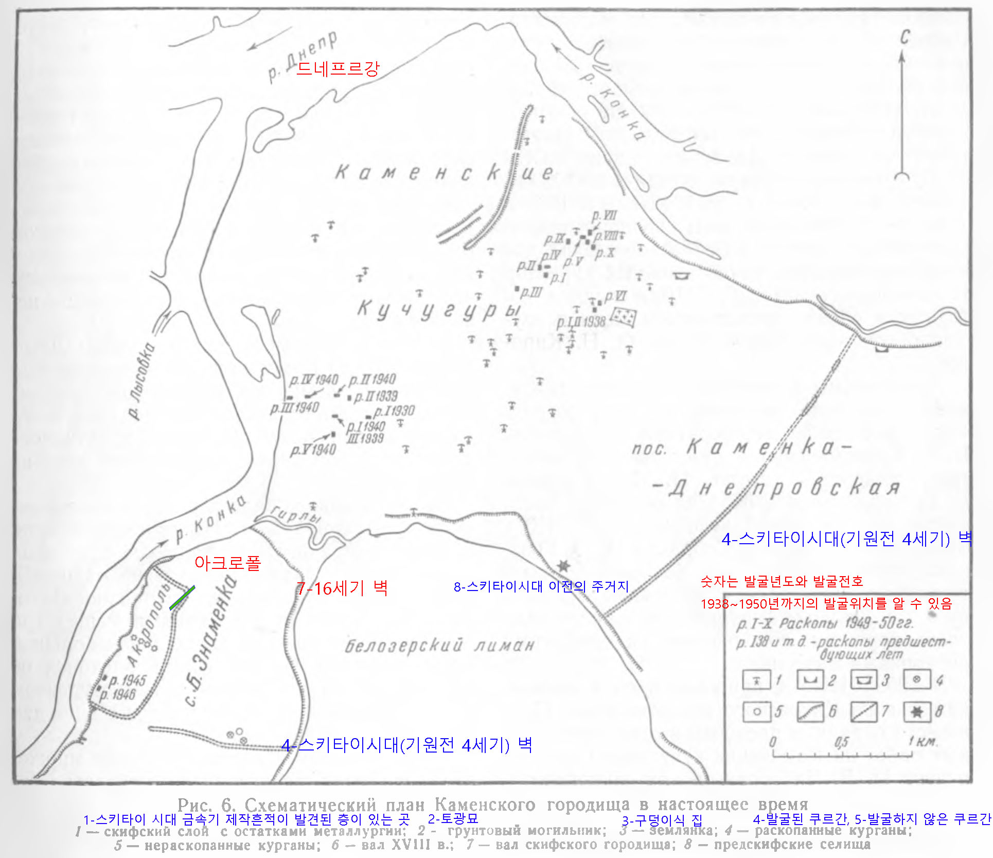 카멘스코예 성곽은 지형을 그대로 이용해서 성벽을 양쪽 끝에 쌓았다. 지형상 좁은 곳에만 성벽을 쌓으면 되는 것이다. 그리고 아크로폴 이라고 불리는 곳에서는 그리스 유물이 많이 출토되고, 그리스식으로 공간을 나눈 구획은 확인되지만 사실 스키타이 사람들이 살았던 구역과 구분되었다. 한 공간에 거주한 것은 맞지만, 스키타이 사람들에 비하면 아주 좁은 공간에서 살았다.