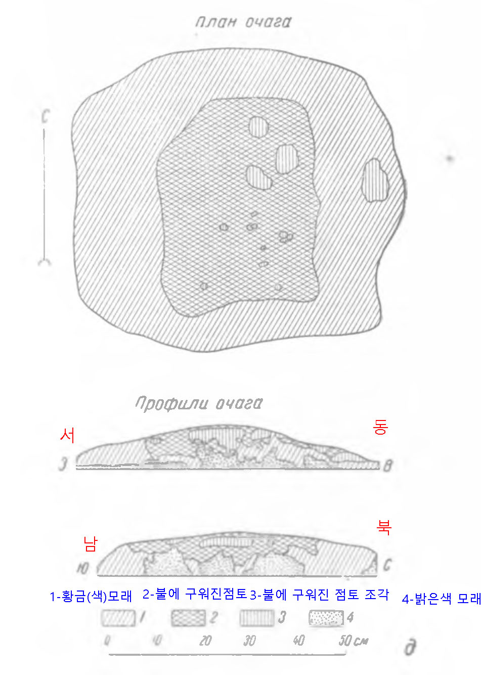 그림 4. 1950년도 발굴범위 9의 3번 주거지의 화덕자리 평면도와 단면도