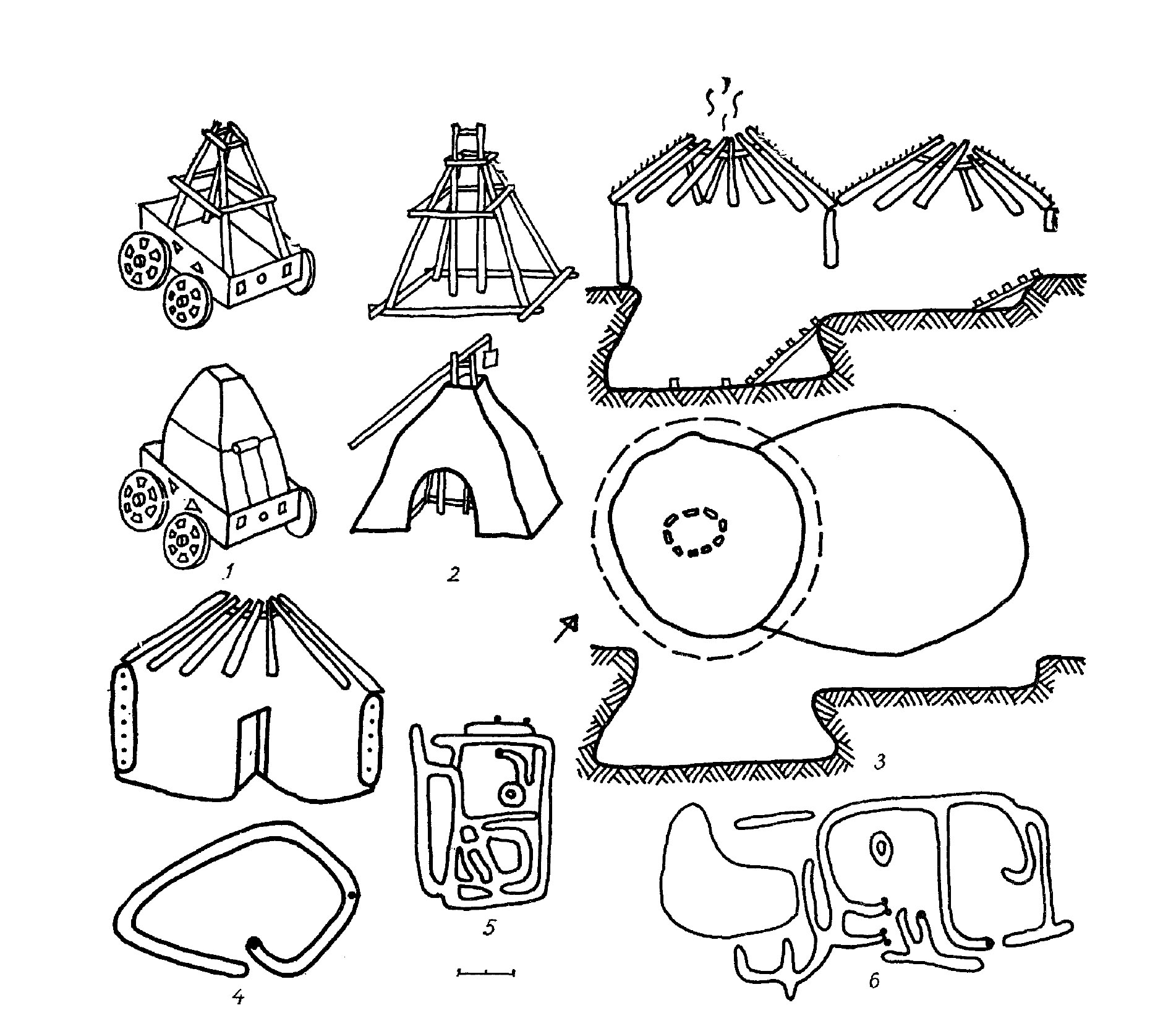 그림 1. 스키타이 문화의 다양한 집 모습, 1,2-바인슈테인 유적 출토, 3-리사야 고라 유적, 4~6: 카멘스코예 성곽 유적(4: 복원도, 5,6-집의 평면도)