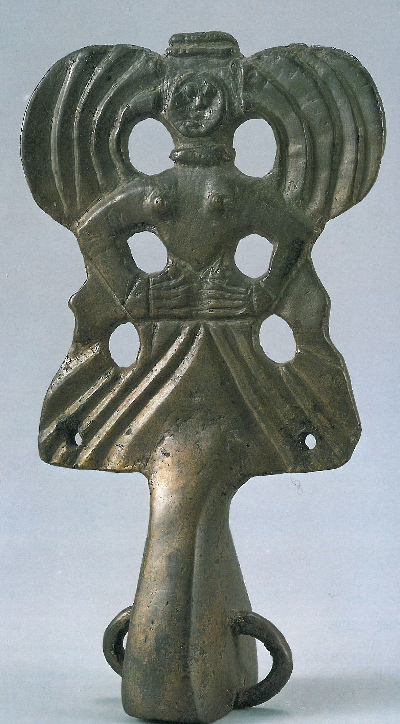 이들은 실제로 유적에서 발견되기도 하고 여성형상물에서도 확인된다. 알렉산드로프스키폴 유적에서 발견된 아르김파사는 티아라를 착용하고 있다(그림 1). 또 비슷한 시기에 알타이의 파지리크 유적 5호의 카페트 속 여성도 무엇인가를 쓰고 있는데, 티아라와 비슷하다(그림 2).