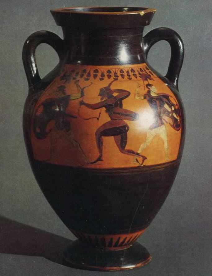 그리스 토기, 암포라(손잡이가 상하로 달린 물병)에 그려진 스키타이 궁수와 hoplites이다. 호플리트는 창과 방패를 주로 사용하는 그리스 시민 군인이고, 투구와 갑옷을 입고 등장한다. 머리에 쓰고 있는 투구가 이들을 상징적으로 표현하는 것이다.