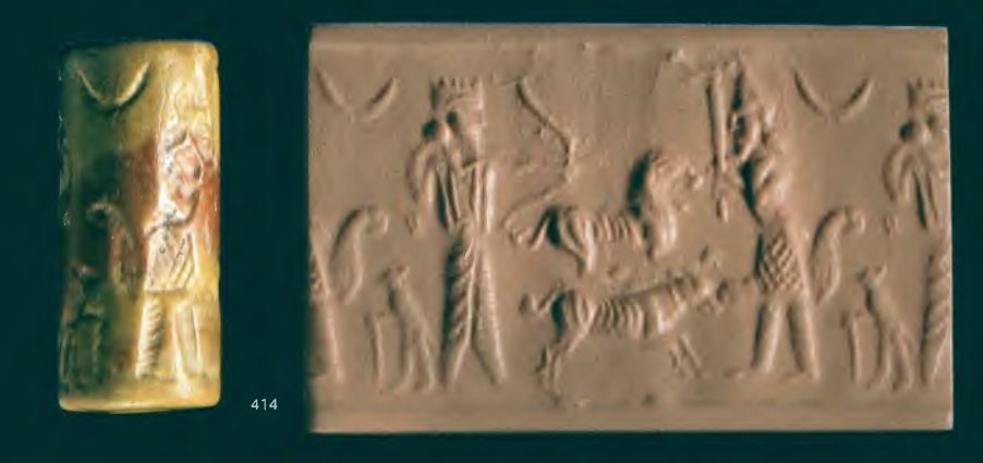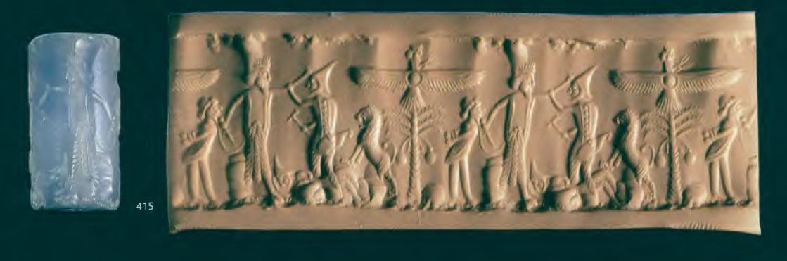 이 유물(그림 1)을 다리우스 왕의 승리를 그린 것이라고 하는 이유는 나무 위에 있는 표식 때문이다. 이것은 아후라마즈다’(조로아스터교의 신) 라고 하는 신의 표식이다. 관을 쓴 페르시아 인들은 다른 도장에도 있지만 아후라마즈다의 표시가 없으면 왕으로 인식하지 않았다(그림 2). 베히스툰 비문에도 가장 상단에 아후라마즈다의 표시가 있고 그 아래에 다리우스왕과 그가 잡아온 포로들을 잡아서 세워 놓았다.( 이 비문의 내용은 고대 그리스 역사가들이 전하는 사건과 달라서 이 비문에 대해서 찬반의 논란이 있다.)
