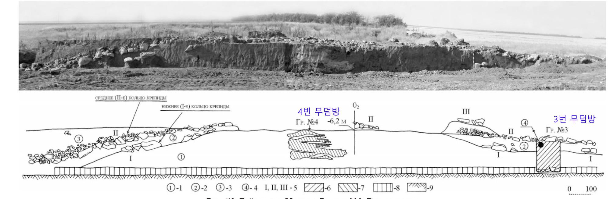 그림 3. 가이모노바 유적 무덤의 단면도(평면도의 3번 단면도) 1: 봉분의 첫 번째(I층) 흙, 2: 첫 번째 흙을 덮은 돌층, 3: 두 번째 덮은 흙, 4: 3번 무덤방 입구에서 발견된 청동, 5: 봉분의 I,II,III층 시작점, 6: 3번 무덤방의 입구를 막은 흙, 7: 4번 무덤방의 단면도, 8: 검은 흙(체르노젬)9: 무덤 생토층