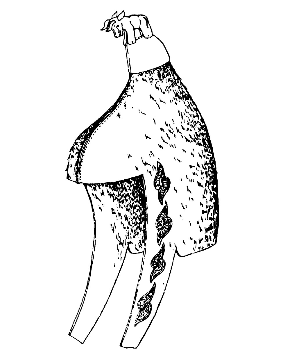 그런데 새머리 고깔모자라고 지칭했지만 자세히 보면 새머리 위에는 산염소 혹은 사슴장식이 더 위에 있다. 굽동물의 뿔이 없어진채 발견되는 경우가 많기 때문에 어떤 동물로 특정하기는 힘들다. 새머리 고깔모자가 발견된 무덤은 베르흐 칼쥔 II유적 3호, 같은 유적 1호, 아크 알라하 1유적의 1호와 2호이다.