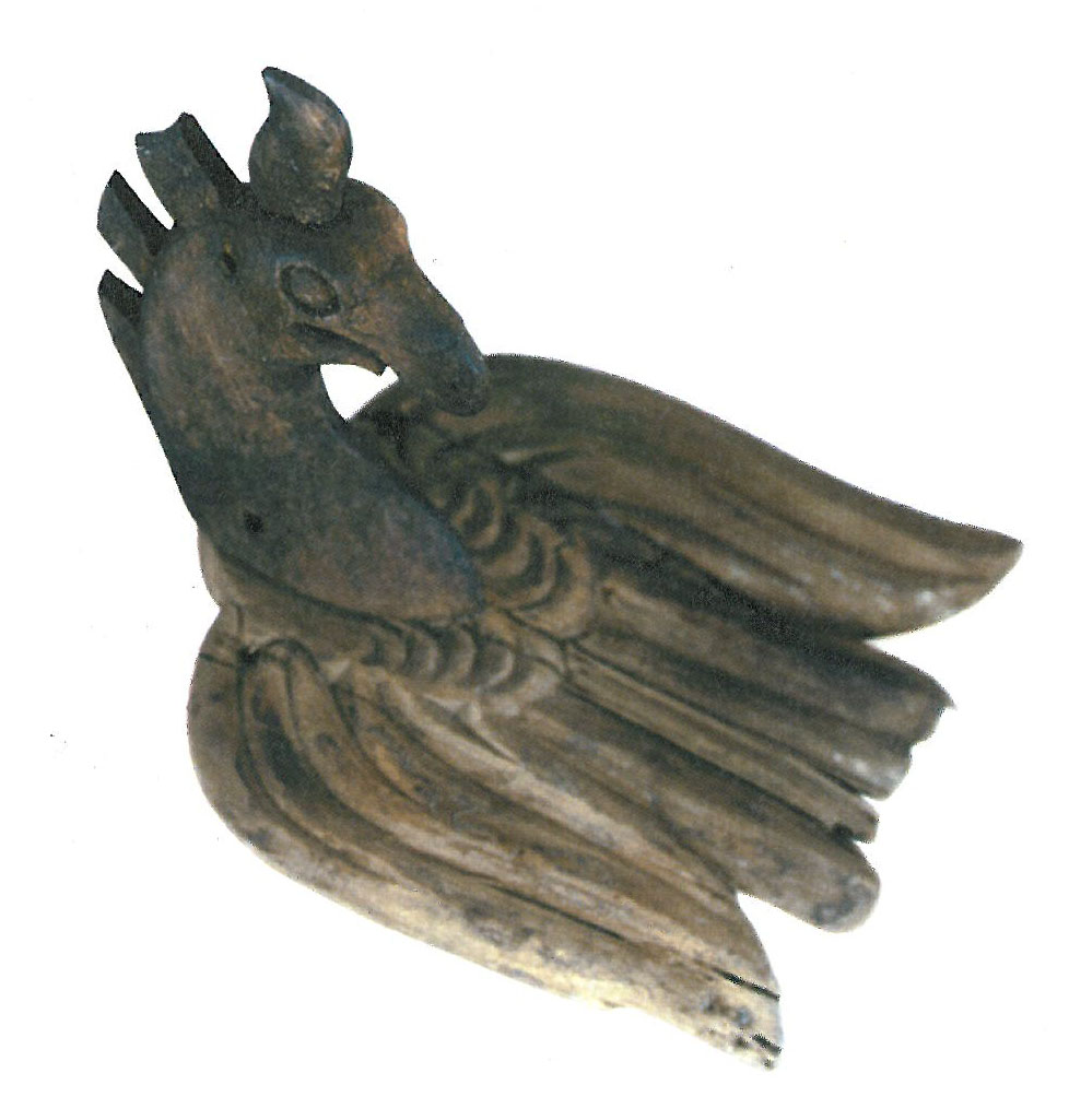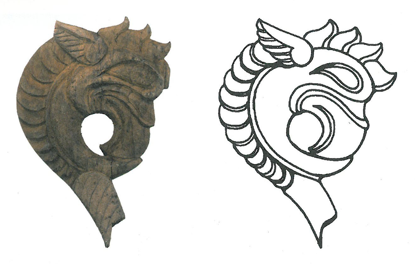 그런데 흥미로운 점은 이 무덤에는 여성 1인만 매장되었지만 남성 유물이 나온다는 점이다. 목제로 된 허리띠 버클 장식과 단검이 출토되었다. 그리고 펠트제 모자를 장식한 목제 동물장식(그림 7)도 남아 있었는데, 이는 베르흐 칼쥔 II유적, 아크 알라하 1유적의 1호분 등 남성 무덤에서 발견되는 남성모자의 부속품이다.