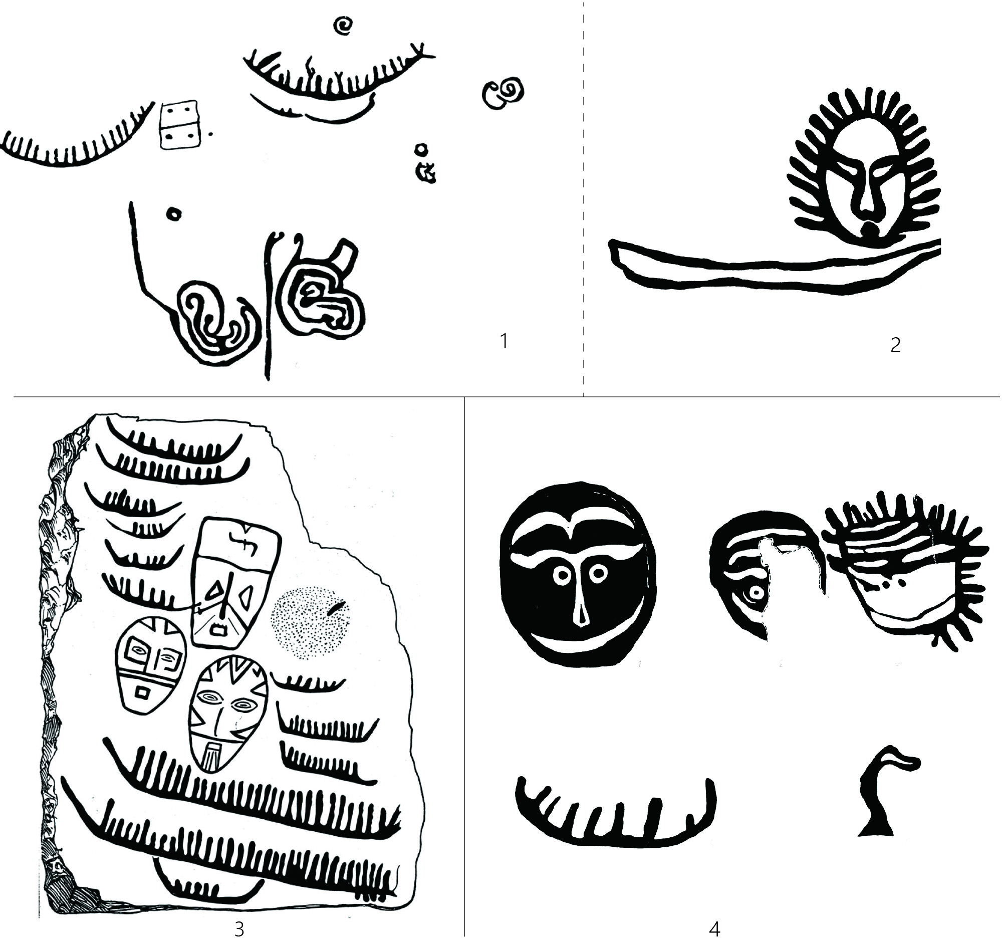 마스크형 암각화(그림 2-2).는 눈이 째진 모양이고 얼굴 주위로 방사선이 달린 채로 표현된 것인데, 사카치 알리안 유적과 세레미체보 유적에서 발견되는 암각화이다. 그렇다면 이 얼굴과 함께 그려진 배도 동 시기의 표현물로 볼 수 있다.