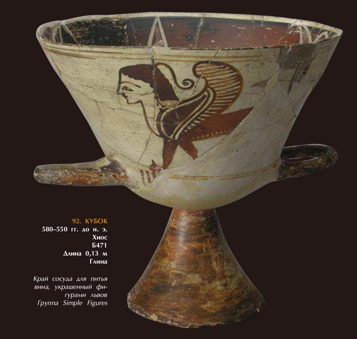 반인반수는 몸통은 사자이고 머리는 사람얼굴을 하고 있다. 이 토기는 기원전 580~550년에 제작된 것으로 매우 구체적인 연대가 있다. 토기의 생김새에 따른 명칭은 쿠복(Кубок)이다. 쿠복은 러시아에서는 와인, 맥주, 꿀물 등 고급스런 음료를 따라 마시는 잔을 통칭한 것이다. 유적에서 나온 토기를 명칭한 것은 와인을 마신 일종의 잔으로써 ‘쿠복’으로 명명되었다.
