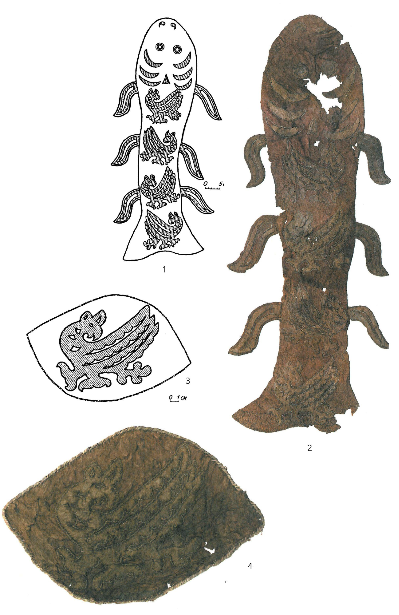 가장 어색한 물고기 장식은 알타이에서 발견되는 것으로 안장을 덮은 덮개의 양쪽 끝에 달려것으로, 말을 장식한 것이다. 파지리크 유적, 투엑타 유적, 바샤다르 유적, 아크 알라하 1유적 등에서 발견된 바 있다. 이들 유물은 흑해지역과 이레크 강 주변에서 발견되는 유물과는 차이가 있다.