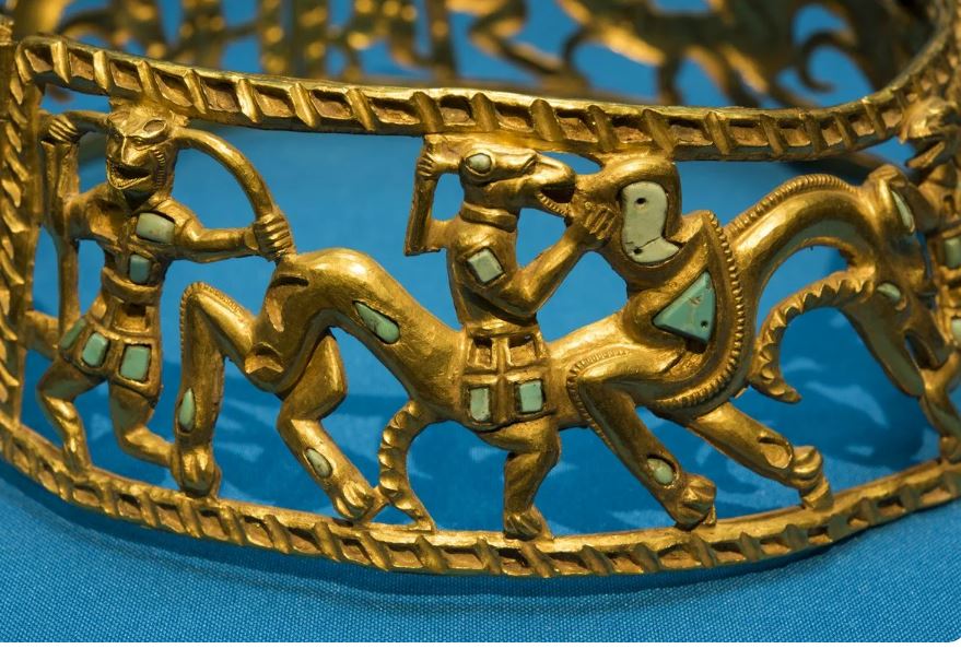 사르마트 문화(기원전 4~기원후 2세기)의 코비야코프스키 무덤 10호에는 특별한 금박장식이 붙은 관이 발견되었다. 주인공은 여성인데, 관과 목걸이를 착용하고 있었다. 특히 목걸이는 화려하기도 하지만 사료적 가치가 큰 유물로 여겨진다.