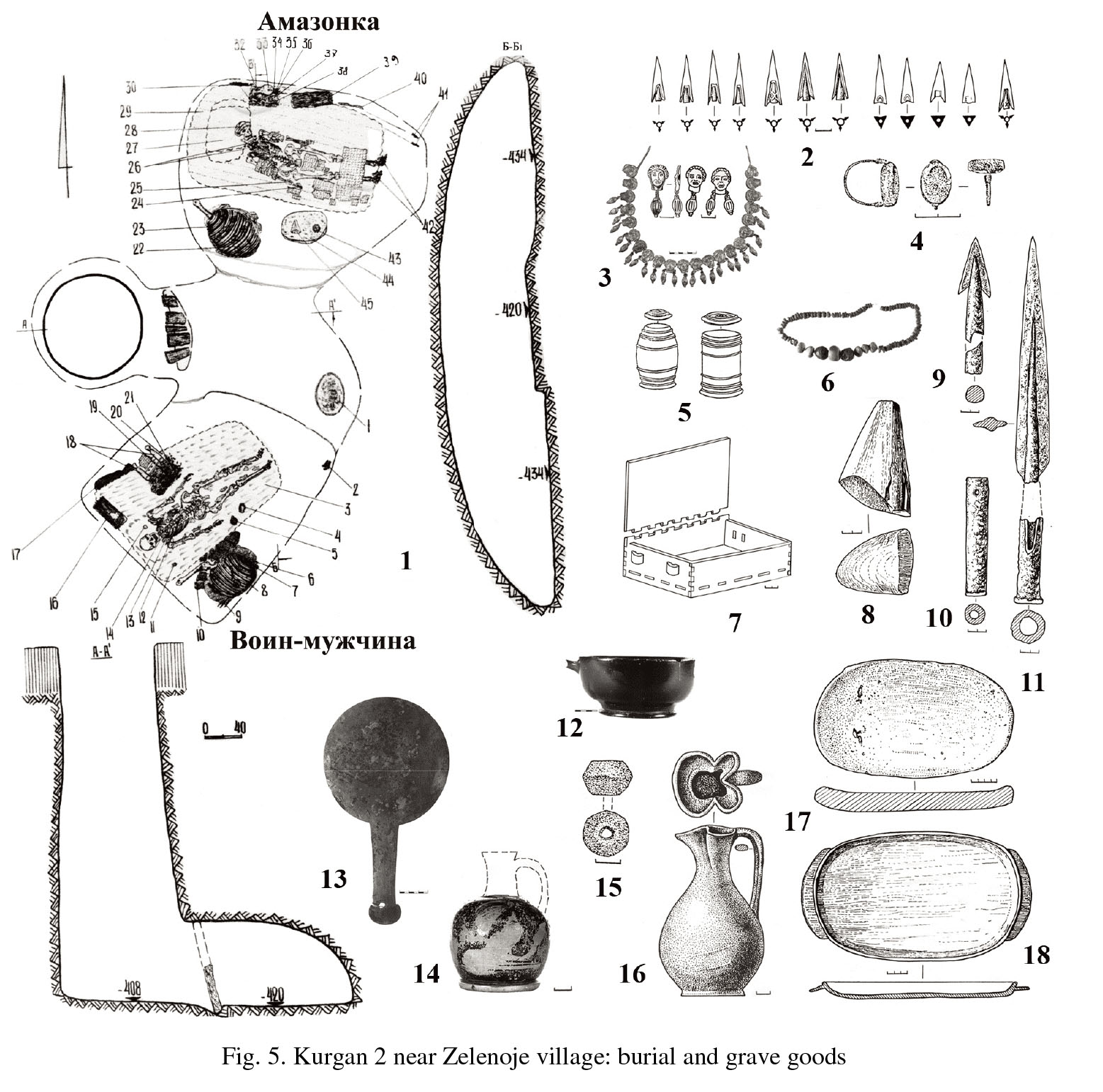 그림 1. 질료니예 마을 부근의 2호 쿠르간, 기원전 4세기, 1: 무덤 평단면도, 2~11: 여성무덤 부장품, 12~18: 남성무덤 부장품