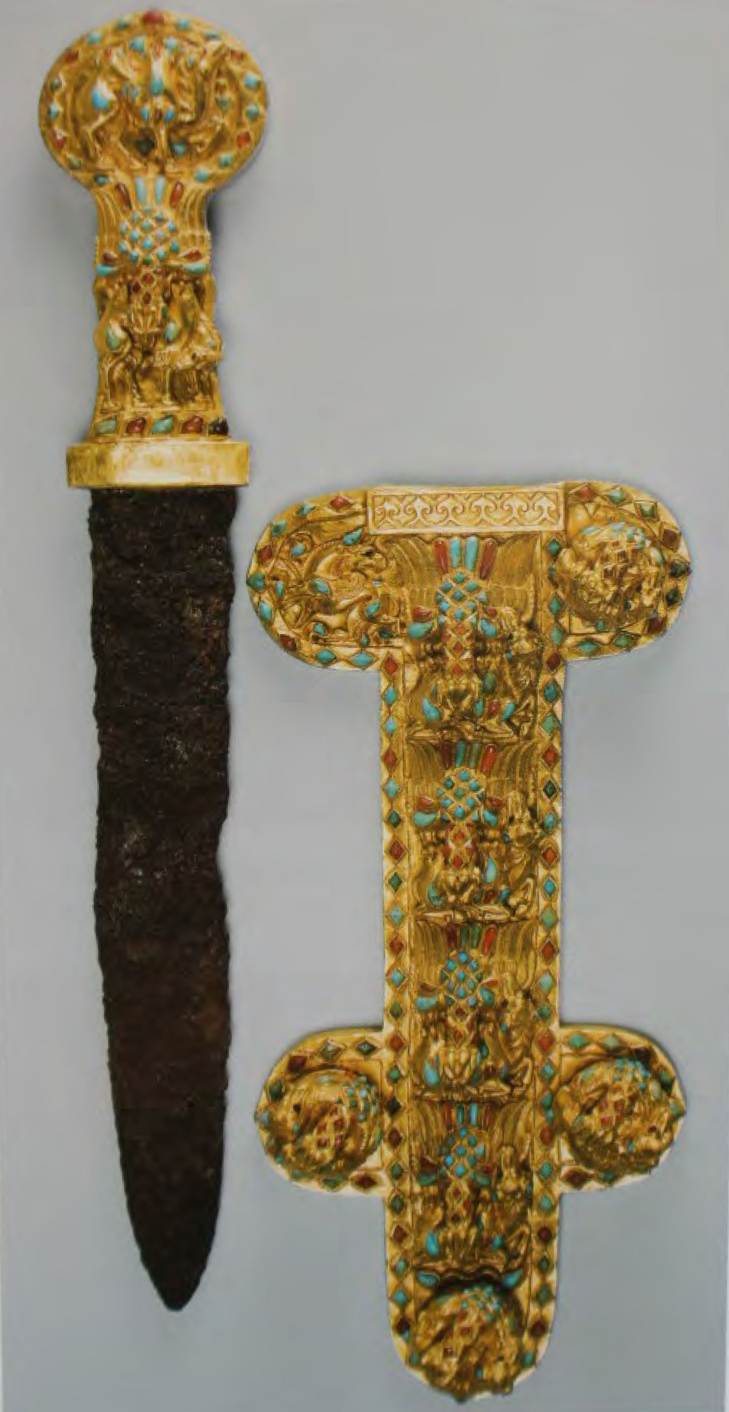 이 검을 보면 생각나는 유물이 있다. 나만 특별하게 그런 것은 아니고 대부분의 연구자들이 이들을 떠올린다. 아프카니스탄 틸랴테페 유적에서 발견된 북방초원의 흔적이 남아 있는 철제 단검으로 역시 화려하게 치장되었다. 검집의 형식이나, 검의 모습등이 상당히 비슷하다. 사르마트 문화의 호흘라치 황금관, 다차 유적의 철제 단검은 틸랴 테페 유적과 관련성이 큰 것으로 연구되었다.