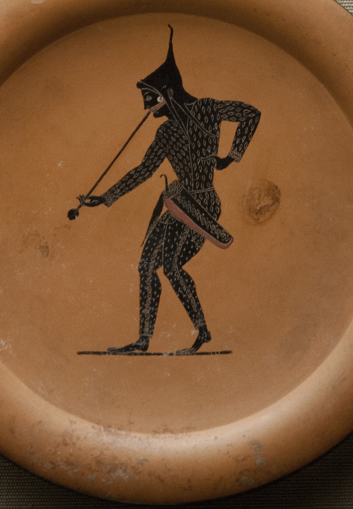 그리스 토기에 그려진 나팔을 불고 있는 스키타이 궁수이다. 분명히 어제 보여드린 에피테토스가 그린 스키타이 사람과는 다르다. 모자와 의복도 약간 차이가 있고, 얼굴표현(특히 코)도 다르다. 특히 모자가 차이가 크다. 에피테토스가 그린 스키타이 궁수의 모자는 정수리에 힘이 없어서 말리는 고깔모자이고, 사이악스의 그림처럼 빳빳하게 세울 수 있는 것이 있다는 것이다. 특히 사이악스가 그린 고깔모자는 중앙부가 급격하게 줄어드는 형태로, 그냥 이등변삼각형 모양(베히스툰 비문)의 고깔모자와도 다르다. 그리고 귀를 덮는 부분이 귀가 보이도록 2갈래로 갈라져 있다.