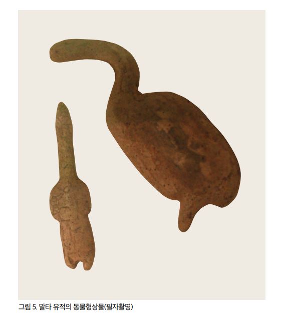 시베리아에서는 14000년 전 말타(Мальта, Malta)와 부레티(Буреть, Buret') 유적에서부터 인간형상물의 전통이 확인되었다. 말타 유적은 주거지 15기가 있는 취락유적으로 각 주거지에서 1개 이상의 인간형상물이 발견된다. 그 중에서 원형의 지상식 주거지 안에 화덕자리에는 인골과 함께 인간형상물(그림 3, 그림 4) 및 동물형상물(그림 5)이 발견되었다. 이를 두고 집 속의 무덤이라고 생각하며, 인간형상물 부장의 시원적인 모습이다. 여성(그림 3, 4-1)은 머리, 몸통, 팔 다리가 뚜렷하게 구분되며, 가슴과 엉덩이를 표현했고, 하반신에 Y존을 뚜렷하게 그려서 여성임을 분명하게 나타내고 있다. 반면에 남성(그림 4-2)은 남성상징형태이고, 몸통 표현은 없고 얼굴만 표현되었다(김재윤 2021b).