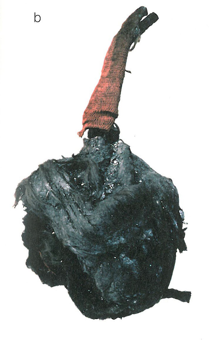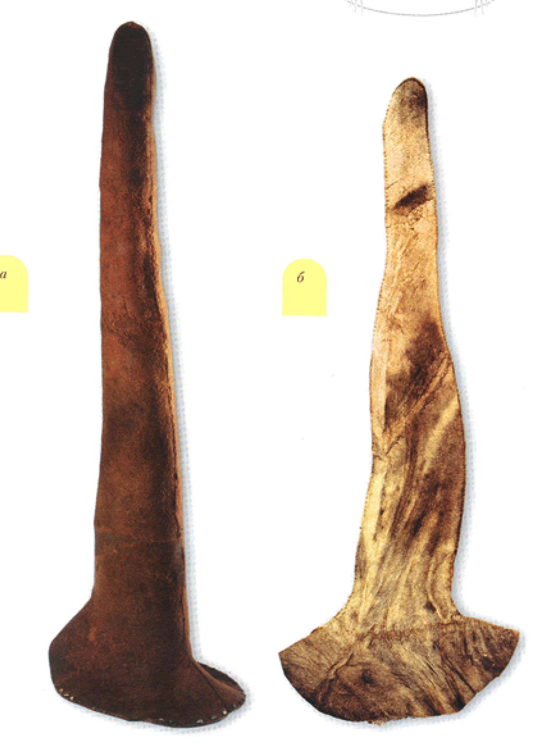 그림 10. 아크 알라하 3유적의 1호분 얼음공주(b)와 파지릭 2호분의 고깔모자(a)(폴로시막`바르코바 2005). 두 고깔모자는 단순히 고깔뿐만 아니라 챙이 붙어 있다.