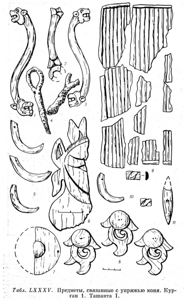 아크 알라하 1유적 1호분을 발굴한 폴로시막은 고렐리크(1987)의 의견을 인용했다. 고렐리크는 파지릭 문화에서 출토되는 방패는 모두 작은데, 보병용 전사의 것이라면 가능하다. 그가 이렇게 이야기 한 이유는 솔로하(흑해 북쪽, 지금의 우크라이나 국경내)라고 하는 유적의 유물 때문이다.