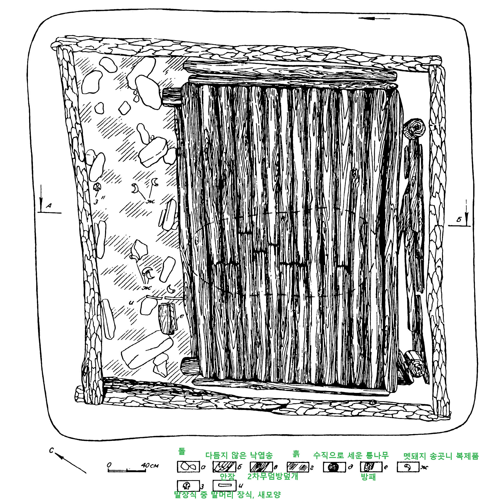 그림2. 아크 알라하 1유적의 1호분 방패, 마구옆에서 출토된 목제 방패