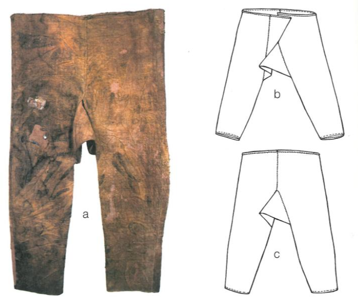 타이즈를 신었기 때문에 바지의 다리 길이가 길 필요가 없었기 때문이다. 그림 1에서도 바지의 흔적은 발목까지 그려져 있지 않다. 이 무덤에는 타이즈가 남아 있지 않지만, 또 다른 남성 무덤인 베르흐 칼쥔 2 유적의 전사는 바지를 입고 타이즈를 신었다.